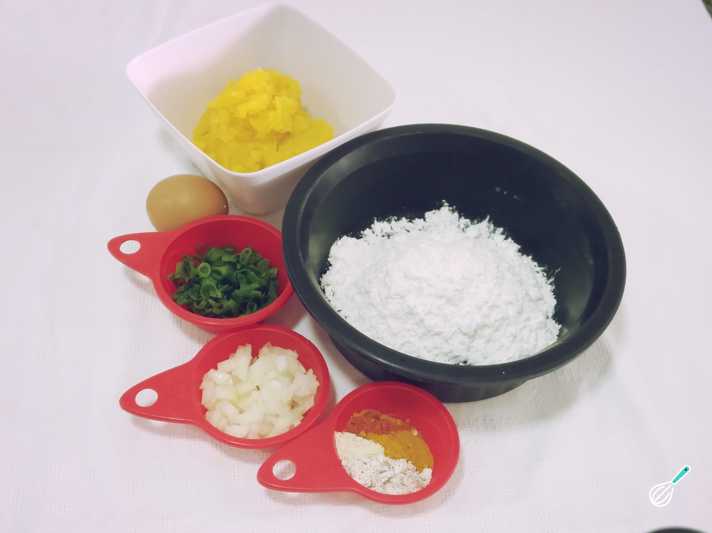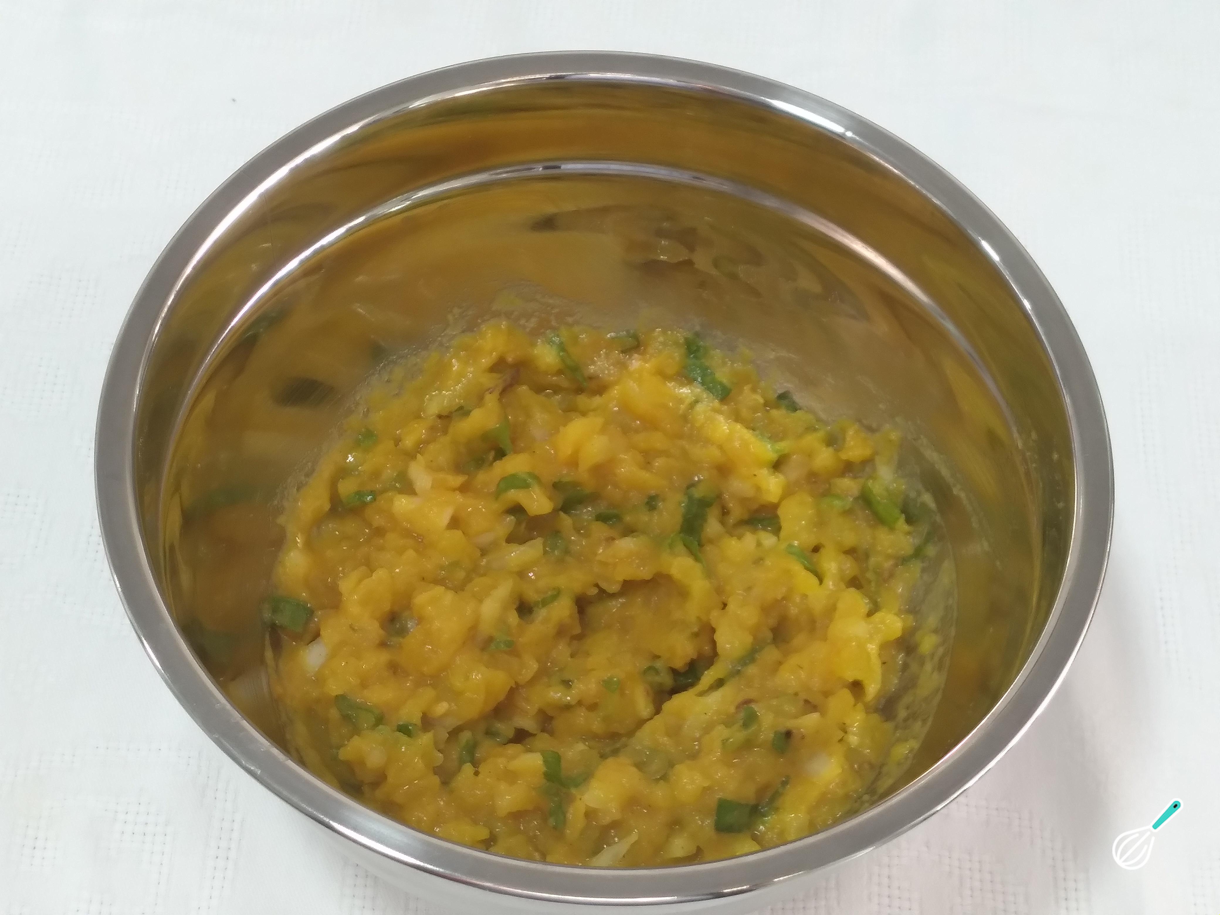 Em seguida, retire a mandioquinha da água e em um prato amasse com um garfo, se certificando de que não haja pedaços grandes. Corte a cebola, a cebolinha e separe os temperos.