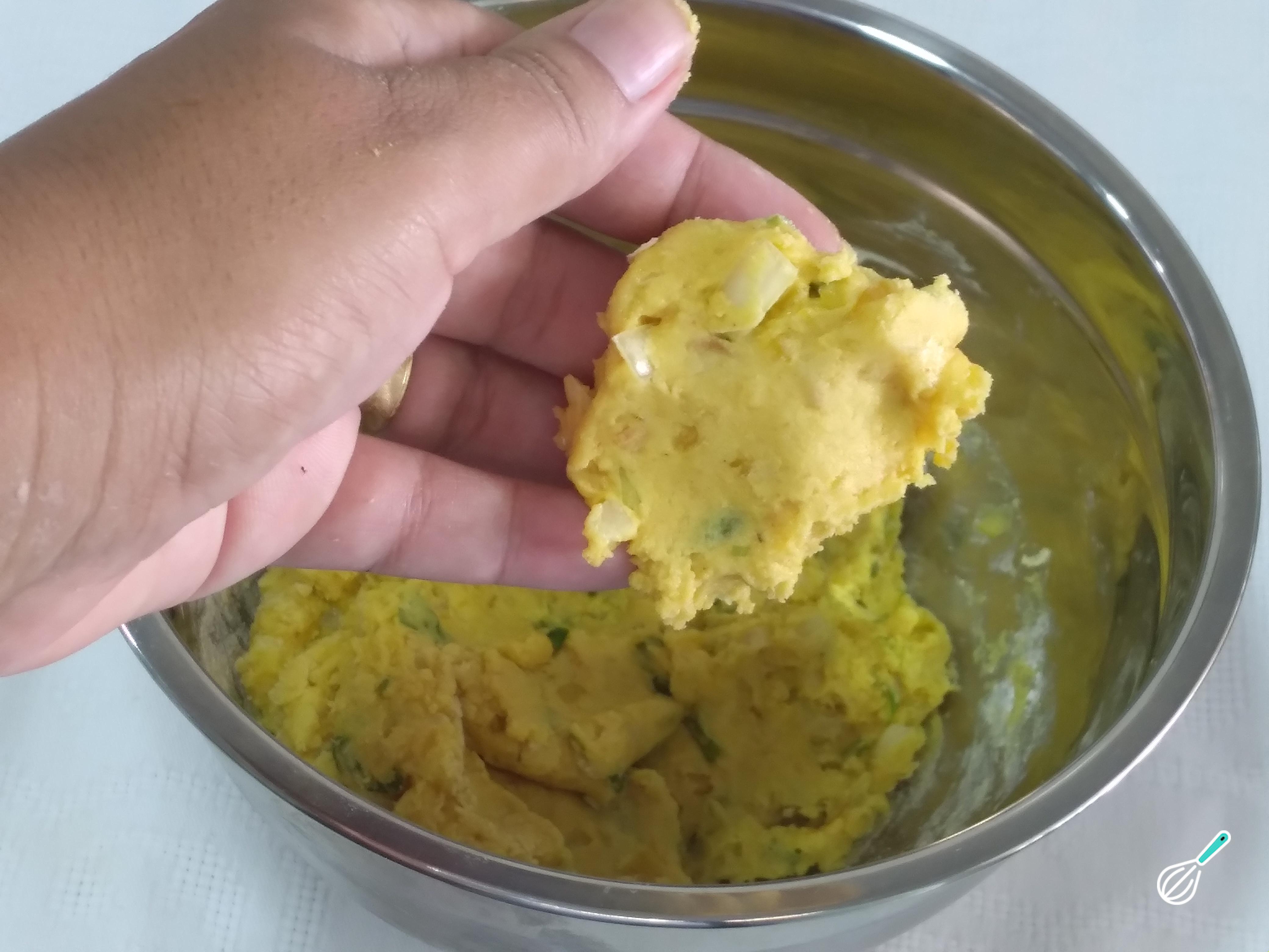Em uma tigela, coloque a mandioquinha amassada, o ovo e misture muito bem.