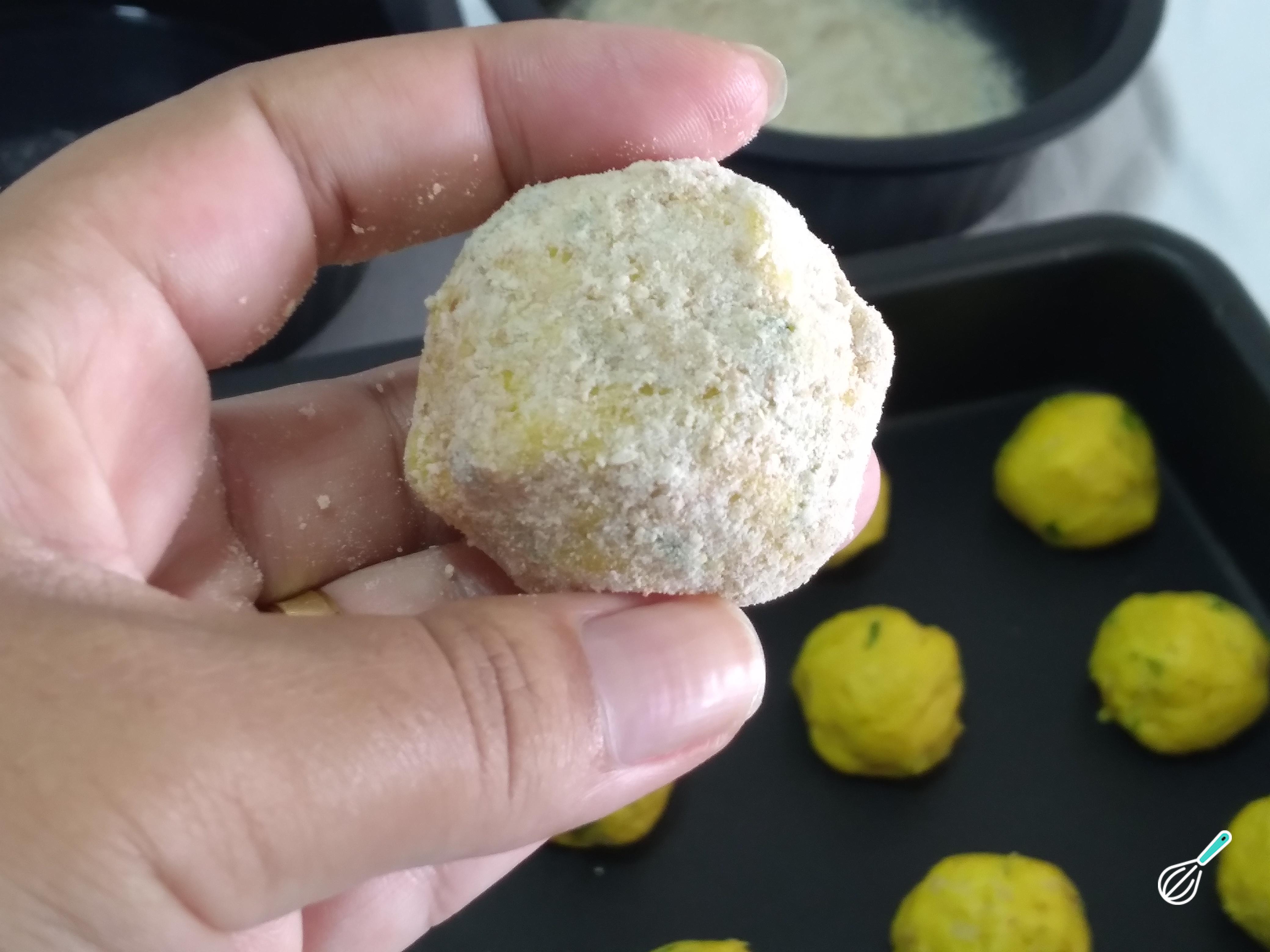 Enrole o bolinho, passe em um pouco de água e depois na farinha de rosca. Leve para o congelador por pelo menos 1 hora antes de fritar.