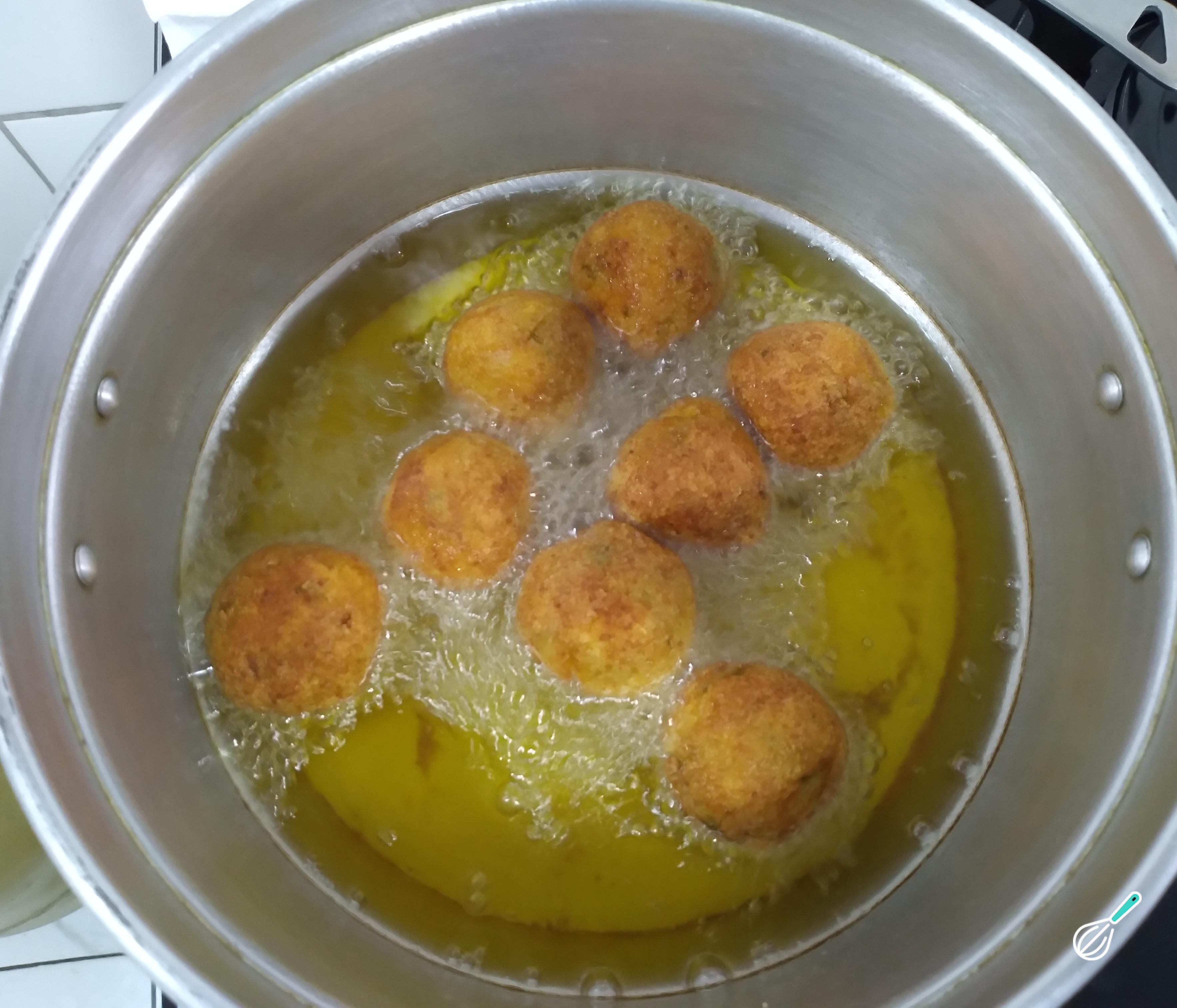 Passado o tempo indicado no congelador, já se pode fritar os bolinhos. Para isso aqueça o óleo de sua preferência e quando estiver bem quente, coloque os bolinhos. Mantenha o fogo de médio para baixo para que não queimem.