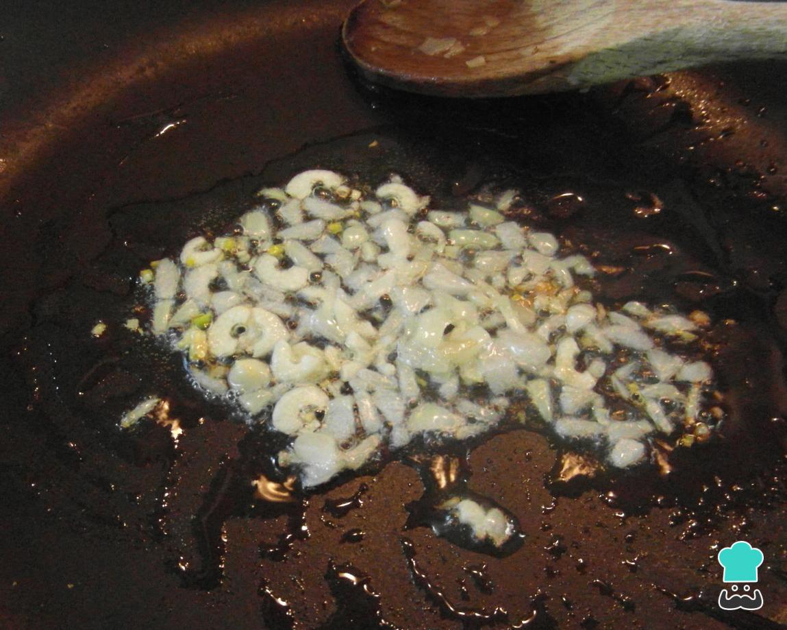 Para preparar esse bolinho de mortadela simples, comece por refogar o alho em uma panela quente com manteiga. Adicione o caldo de carne previamente dissolvido em água quente e deixe levantar fervura.