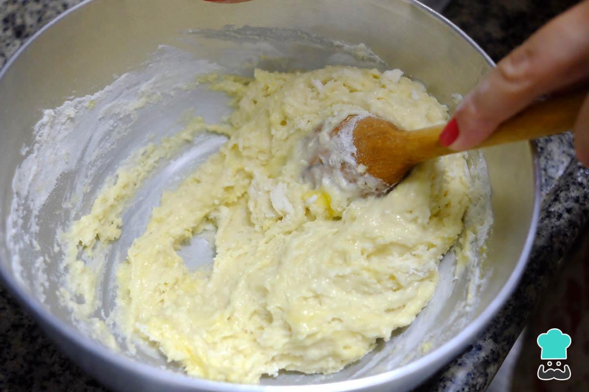 Quando ferver, junte a farinha de trigo, mexendo bem para evitar que se formem grumos. Deixe cozinhar até a massa deixar de grudar no fundo da panela.