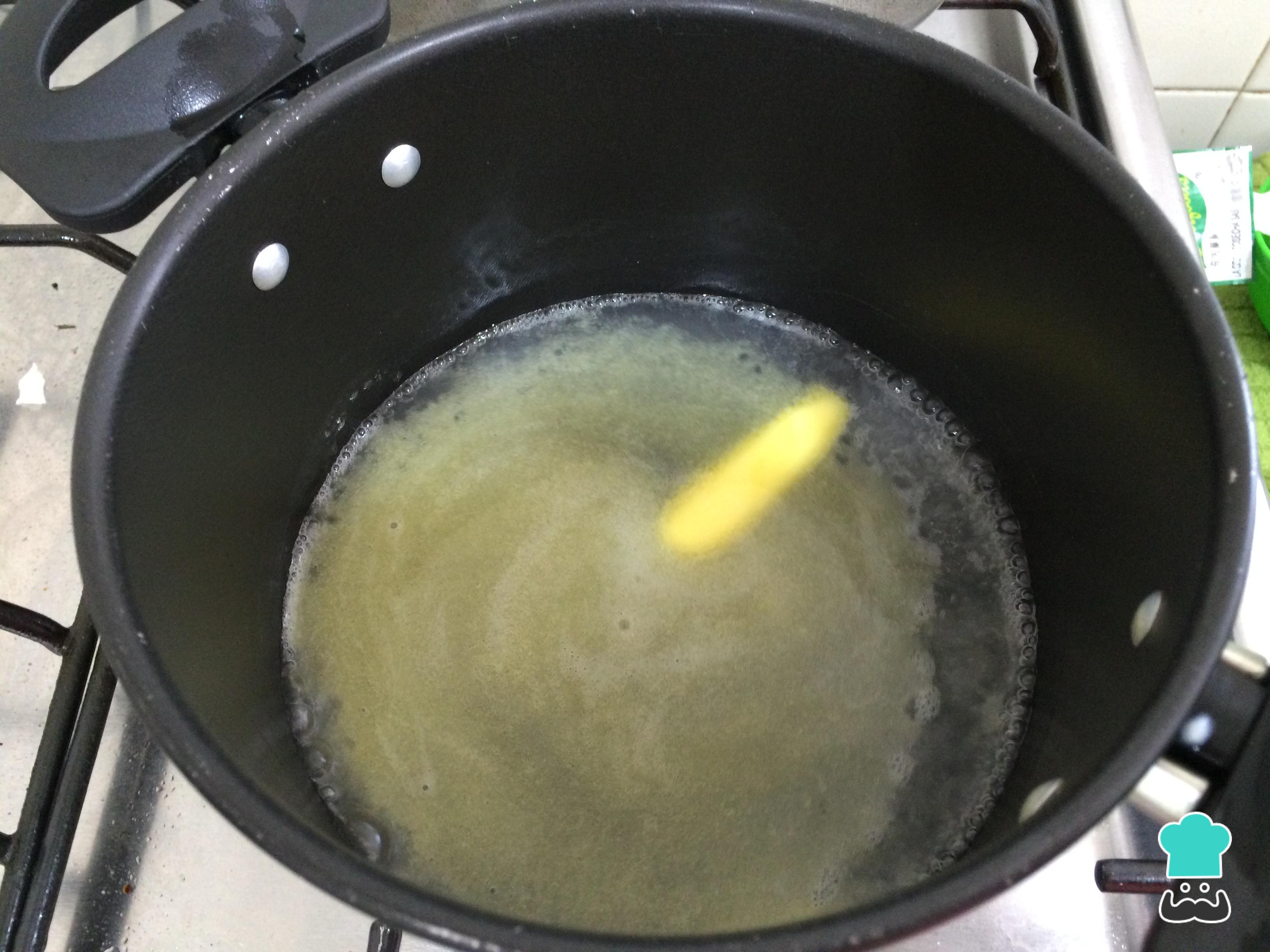 Em uma panela ferva a água, adicione o sal e a manteiga e misture até derreter completamente.