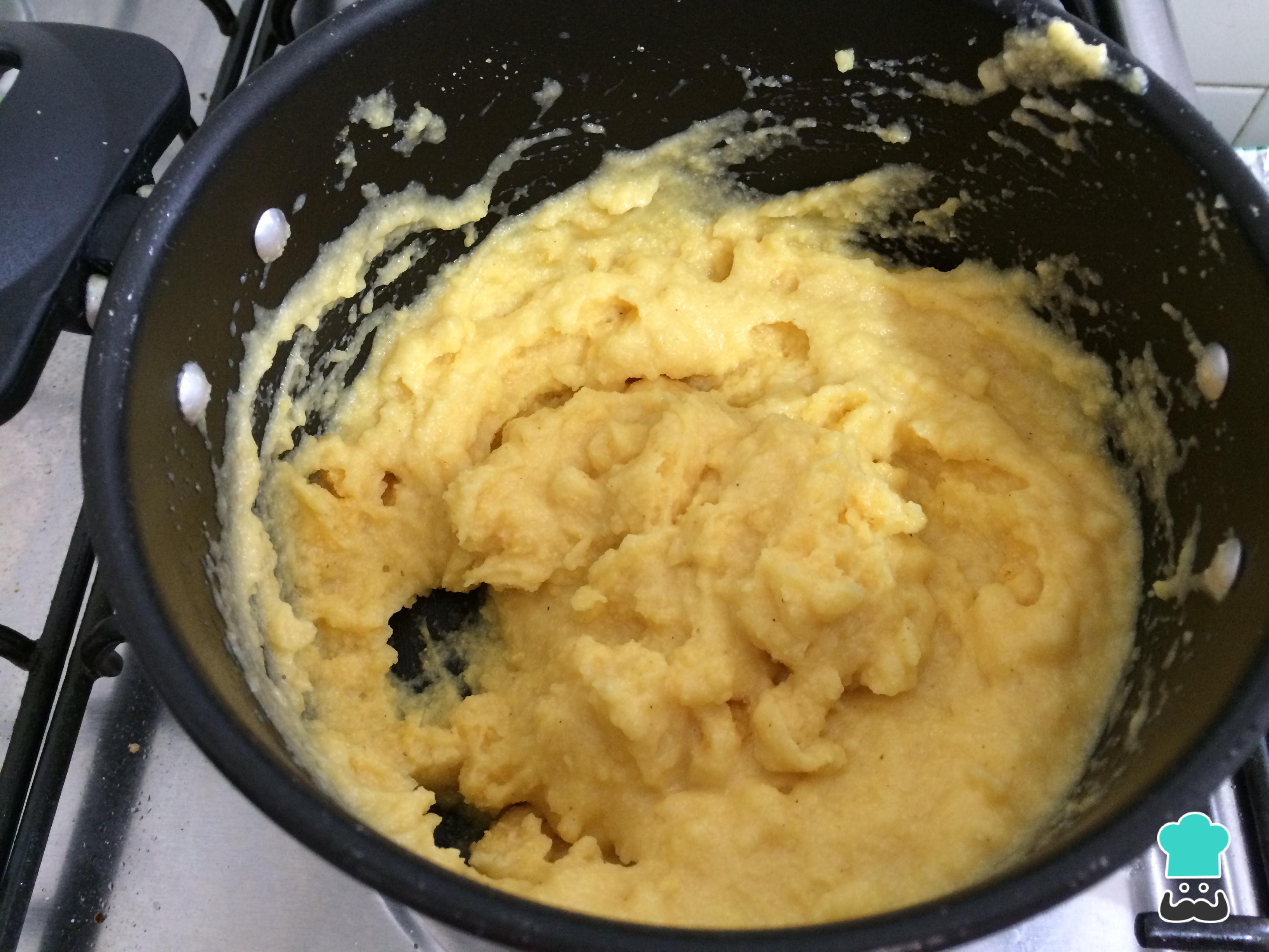 Adicione a farinha de milho de uma vez só e mexa para formar uma massa cremosa e macia, o que não demorará mais de 1-2 minutos. Desligue e deixe esfriar.
