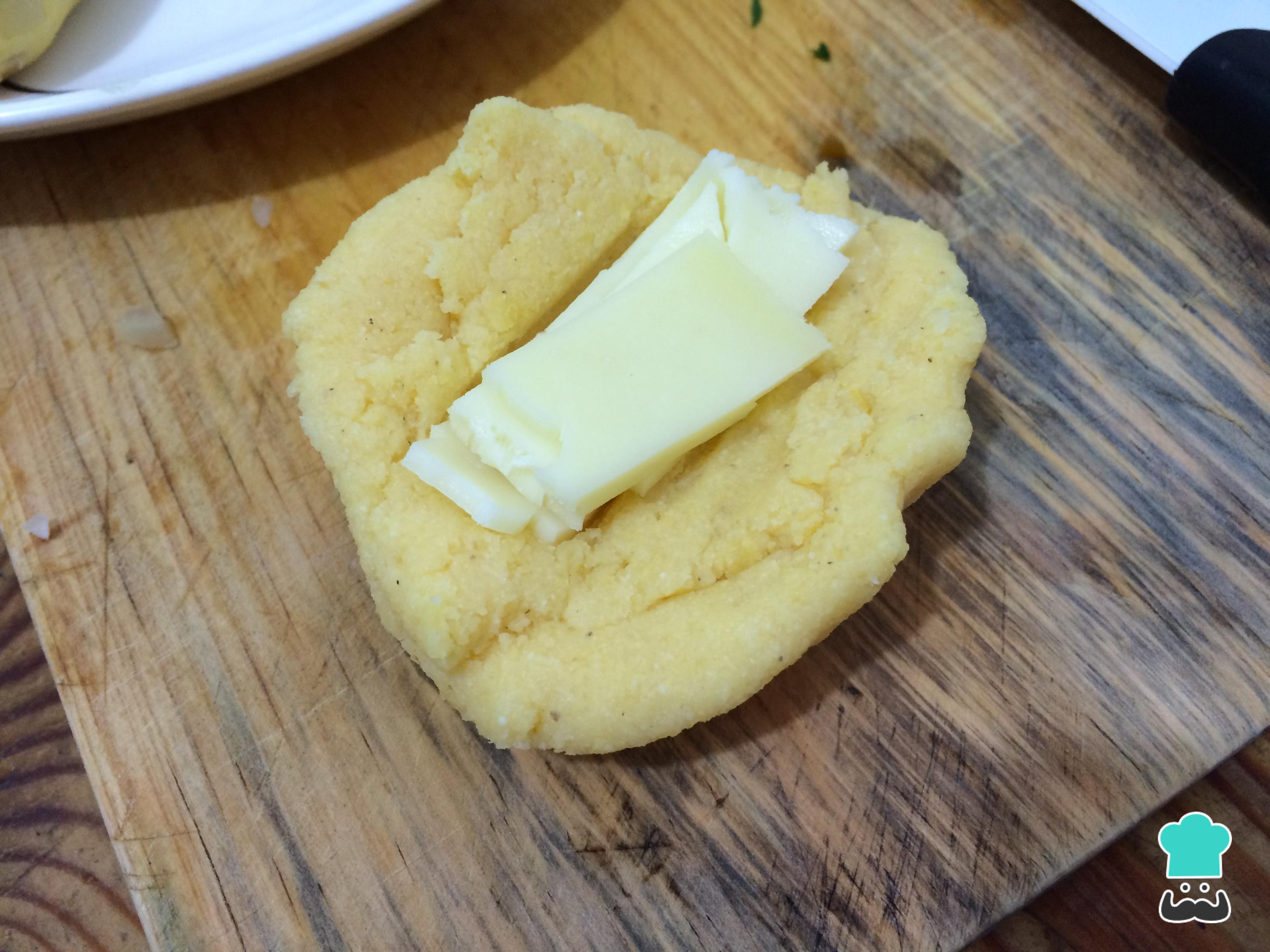 Quando a massa estiver fria, modele pequenas bolas de polenta, abra na mão e recheie com um pouco de queijo. Repita até ter vários bolinhos do mesmo tamanho.