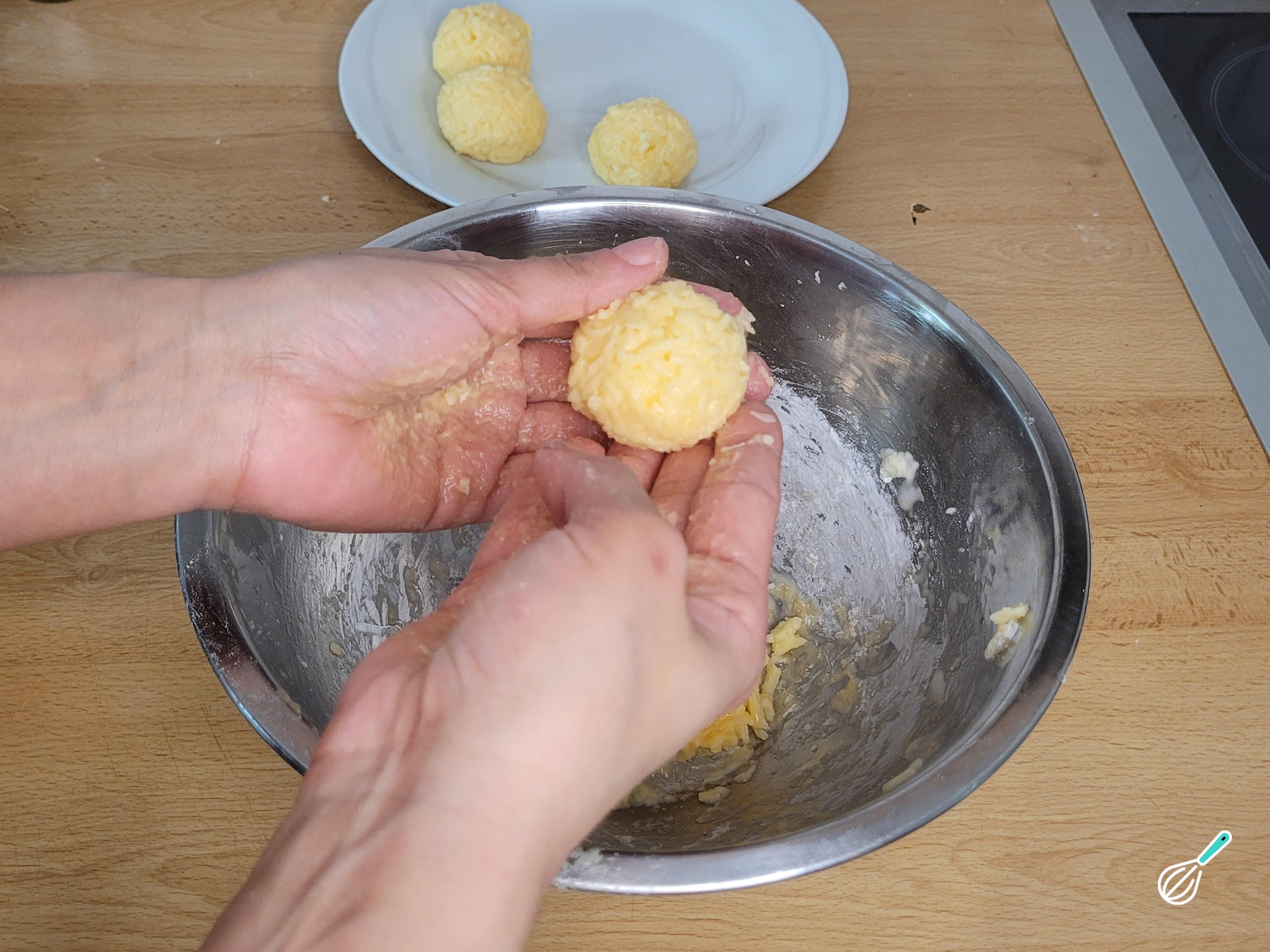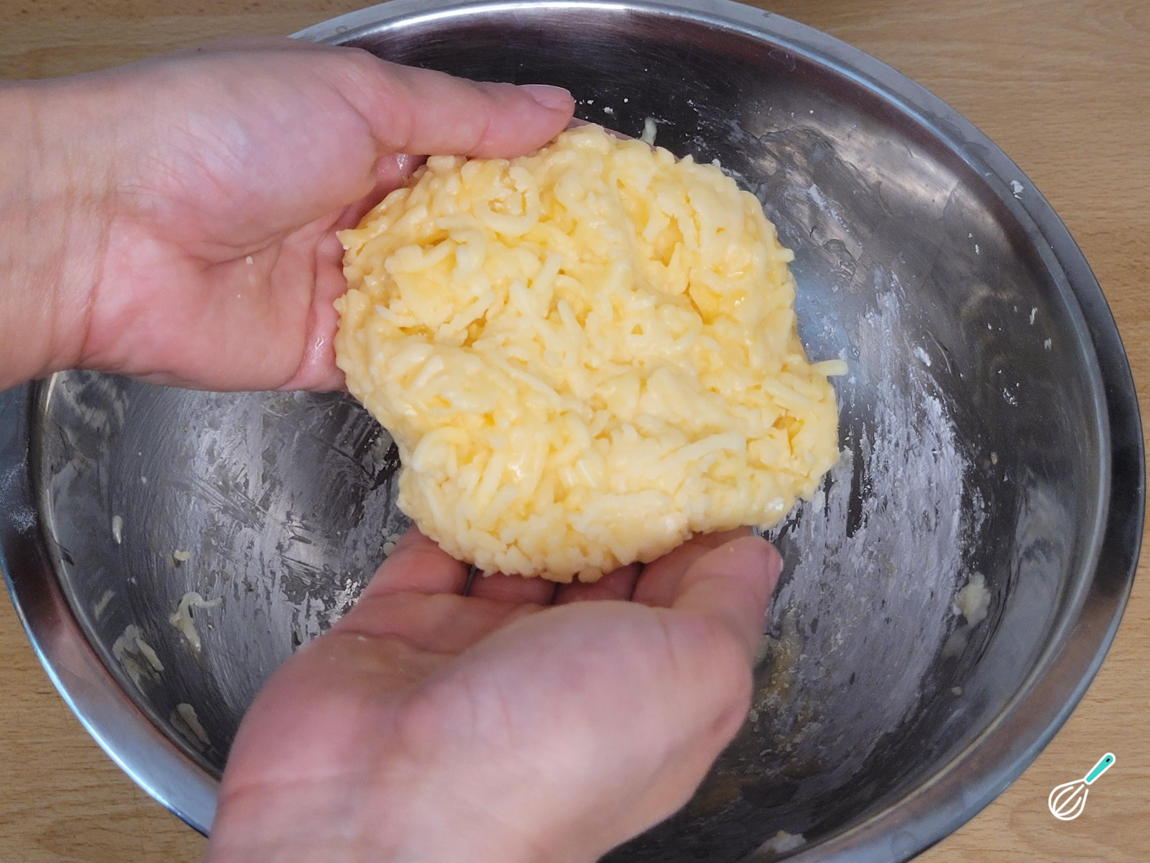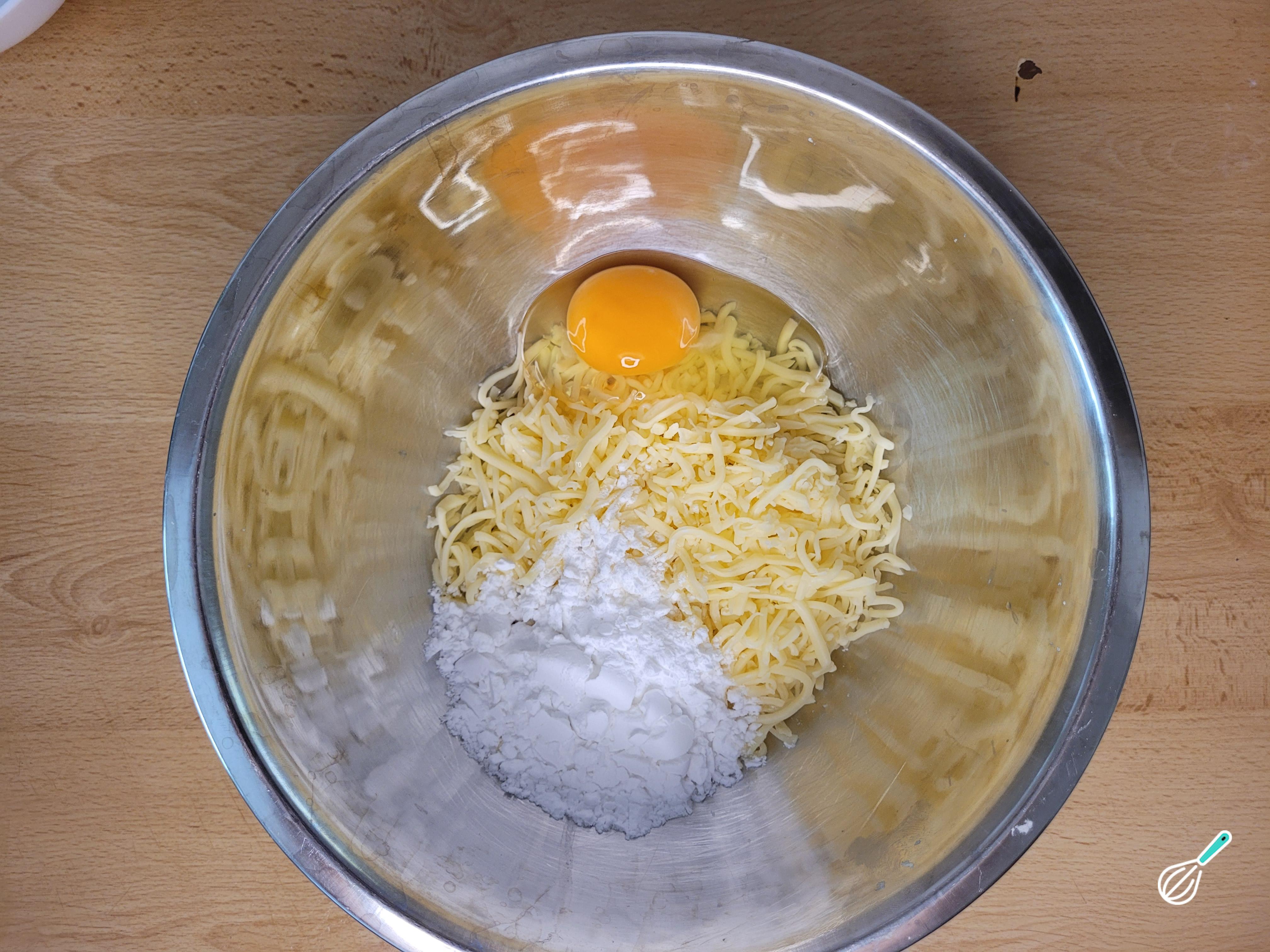 Coloque o queijo e o ovo, adicione o amido de milho aos poucos e comece a misturar com as mãos.