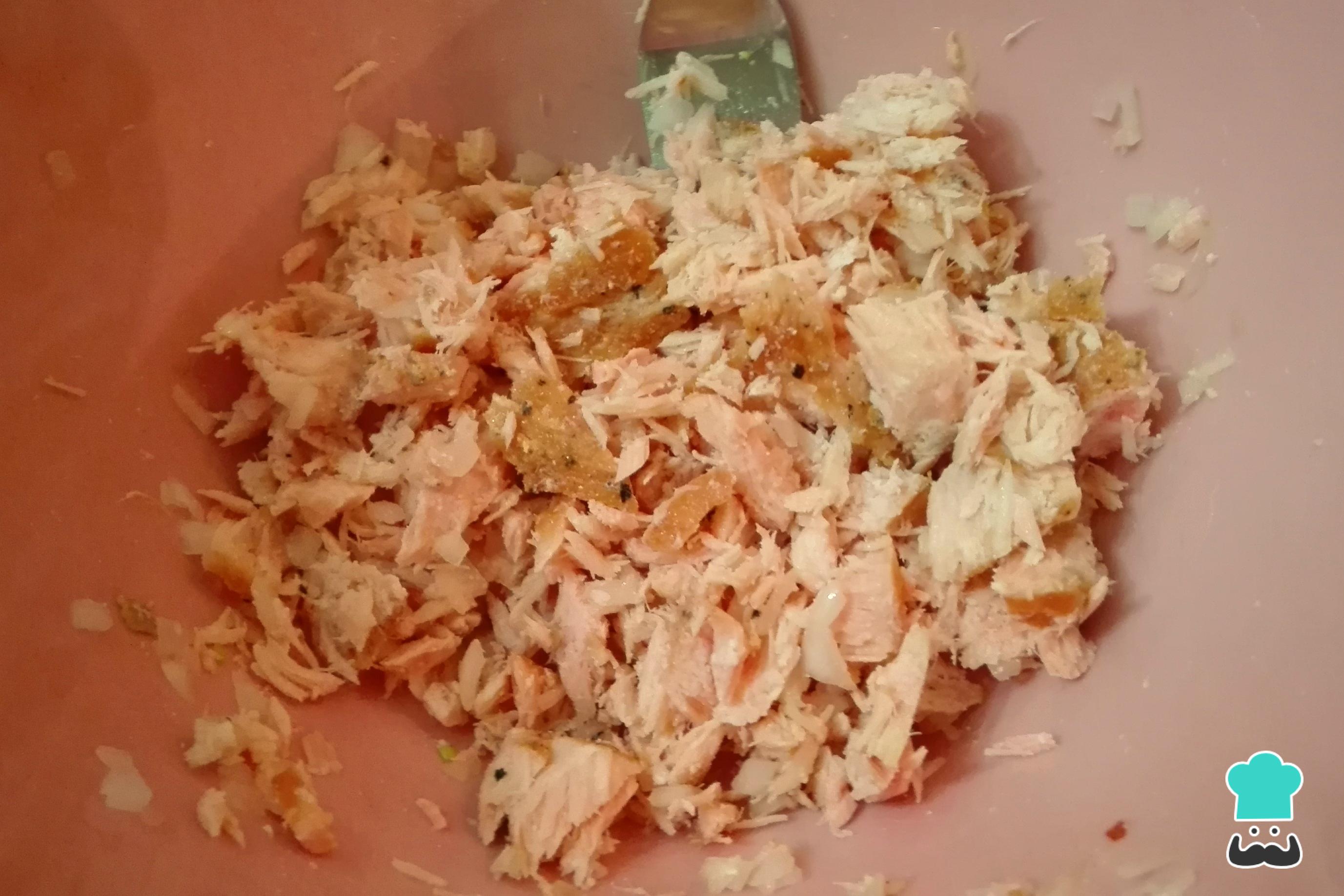 Para começar esta receita com sobras de salmão, o primeiro passo é desfiar o salmão e retirar-lhe pele e espinhas, caso tenha. Coloque em uma tigela junto com a cebola picada.