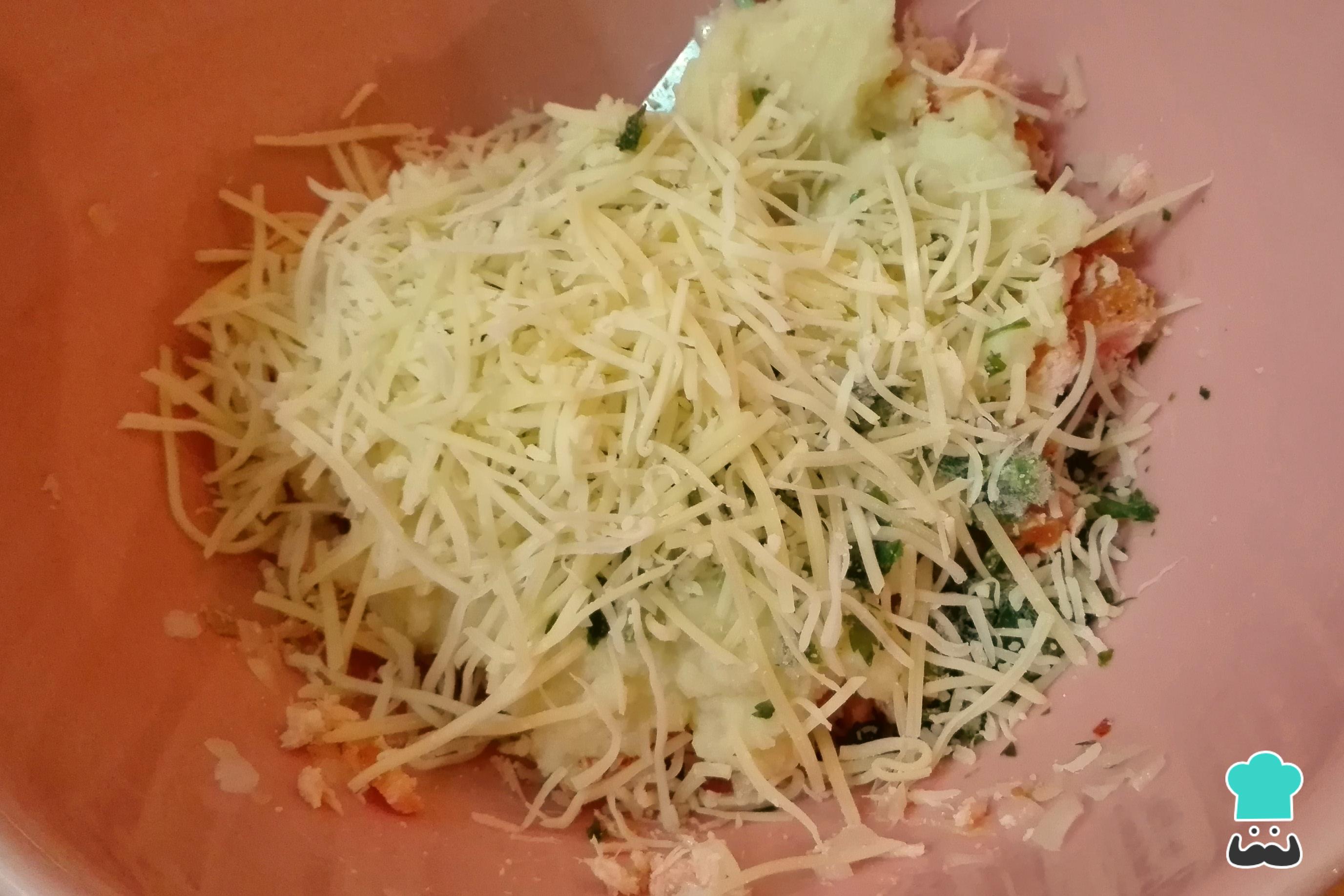 Em seguida acrescente as batatas esmagadas, a salsinha e o queijo ralado e misture.