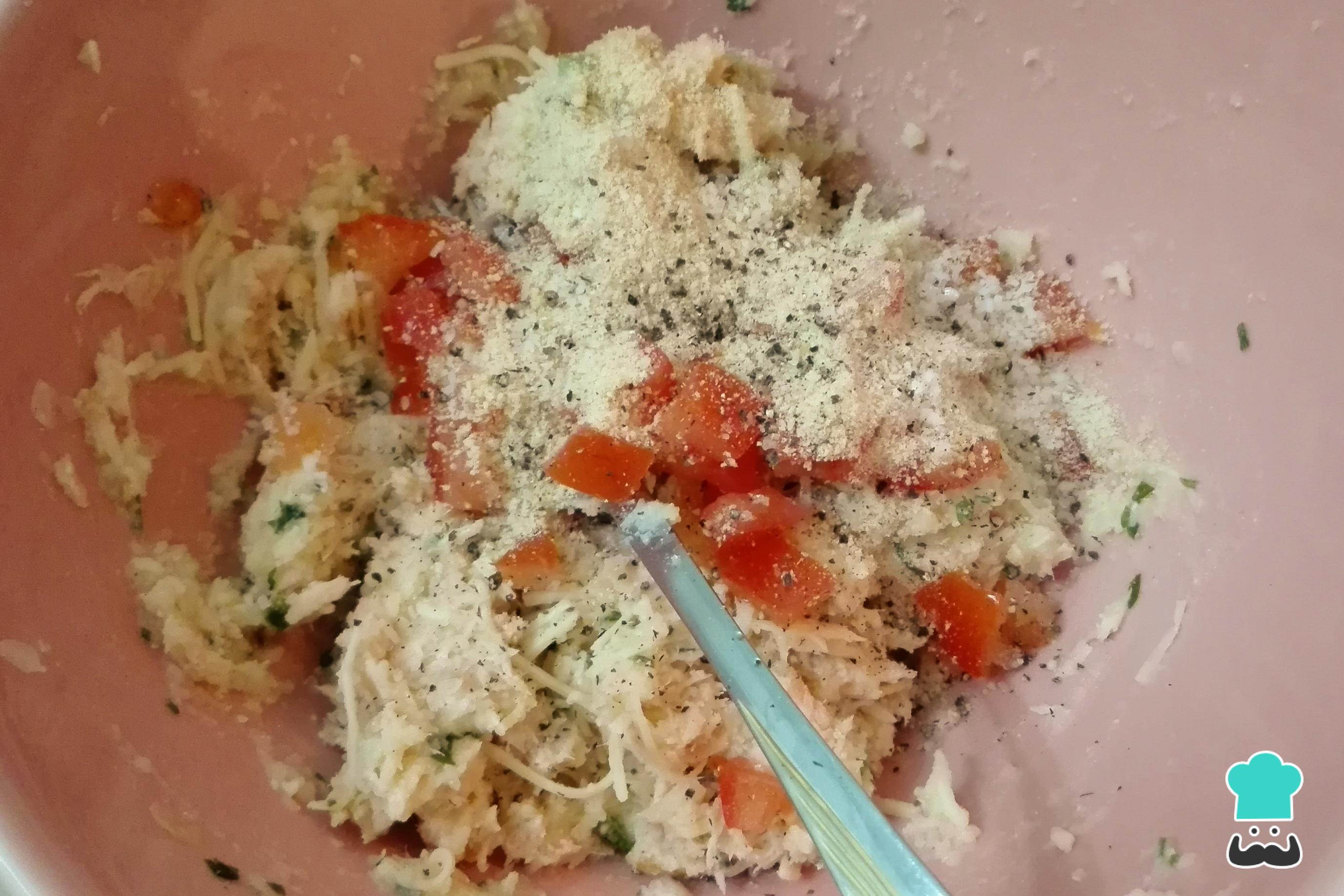 Complete com o tomate cortado em pedaços, 1 a 2 colheres de sopa de farinha de rosca, sal e pimenta a gosto, e misture tudo. O resultado deve ser uma mistura consistente e que não gruda muito.