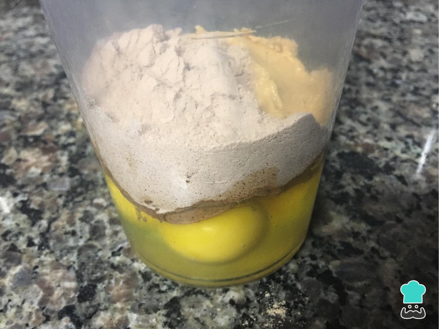 Com auxílio de um mixer ou no liquidificador, bata os ovos com o whey e a pasta de amendoim.