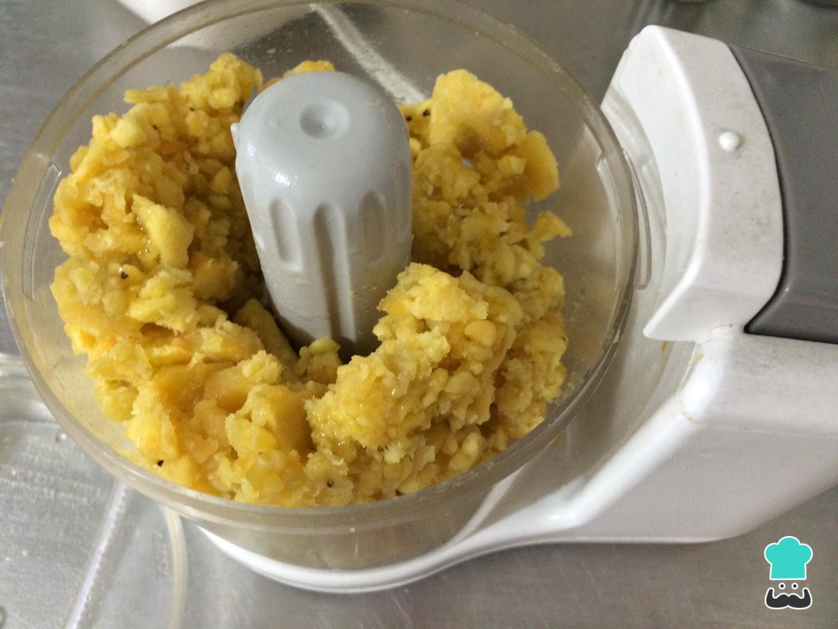 Num liquidificador ou processador de alimentos, coloque a banana verde e bata muito bem, até obter a consistência de um purê. Tempere com sal e pimenta a gosto.