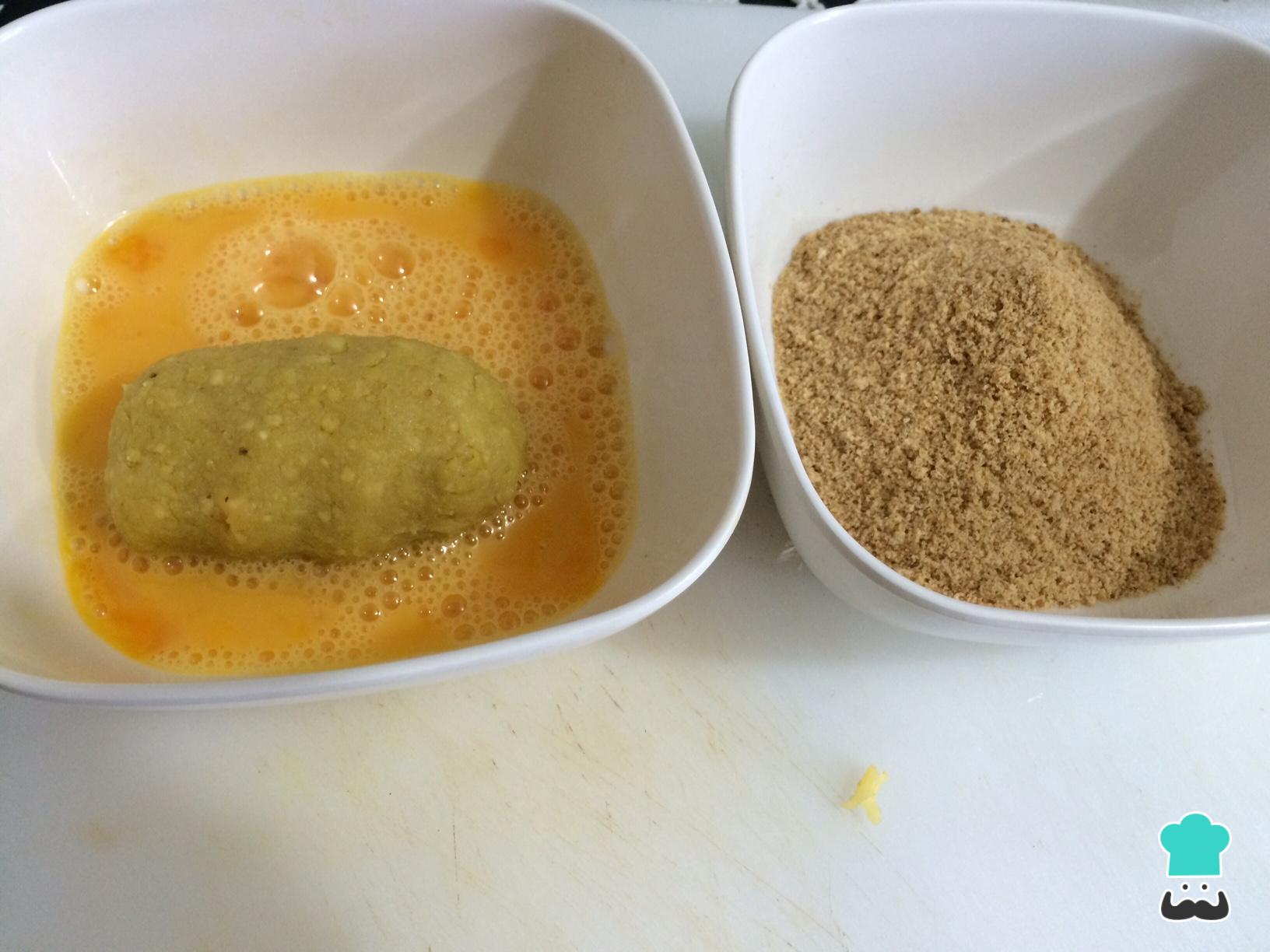 É hora de passar os bolinhos de banana por ovo batido e farinha de rosca, de forma a empanar completamente.