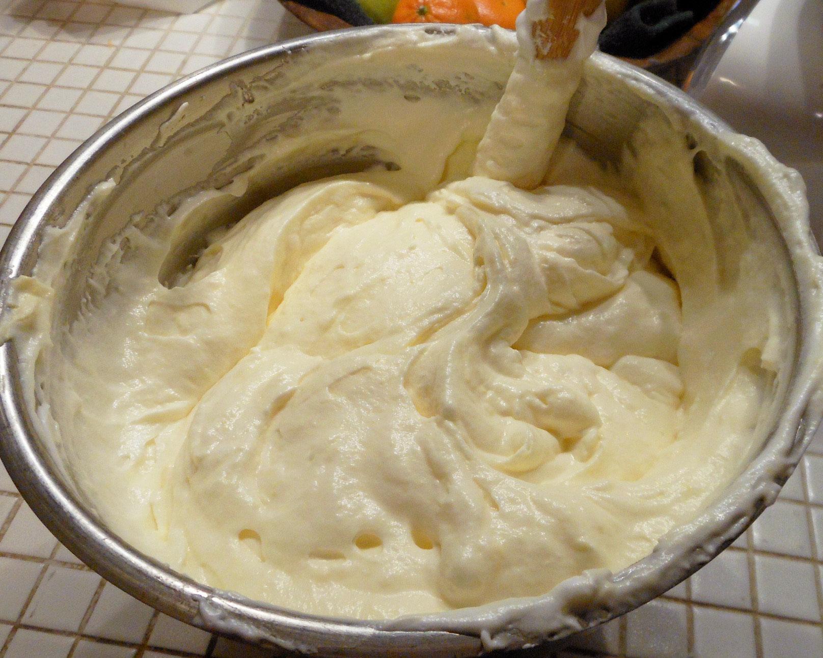 Junte a baunilha e o leite ao creme de gemas e açúcar e misture. Adicione a farinha peneirada pouco a pouco, mexendo entre cada adição, para que não se formem grumos e para que a massa não fique pesada.