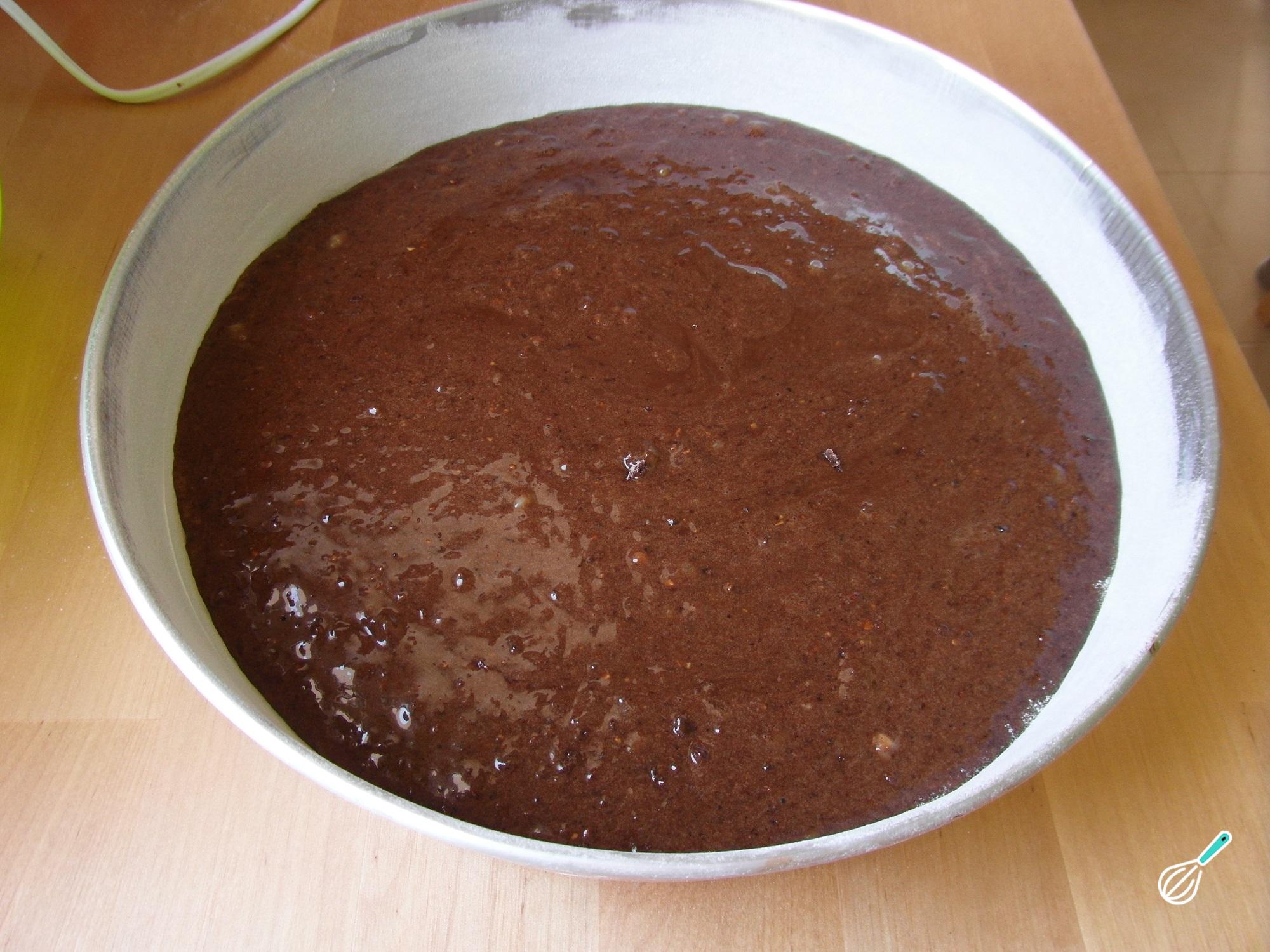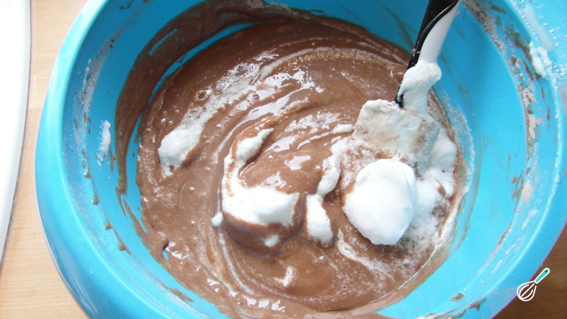 De seguida, bata as claras até o ponto de neve em um recipiente separado. Delicadamente, incorpore-as na massa e junte o fermento. Misture com uma espátula e transfira a massa para uma assadeira previamente untada.