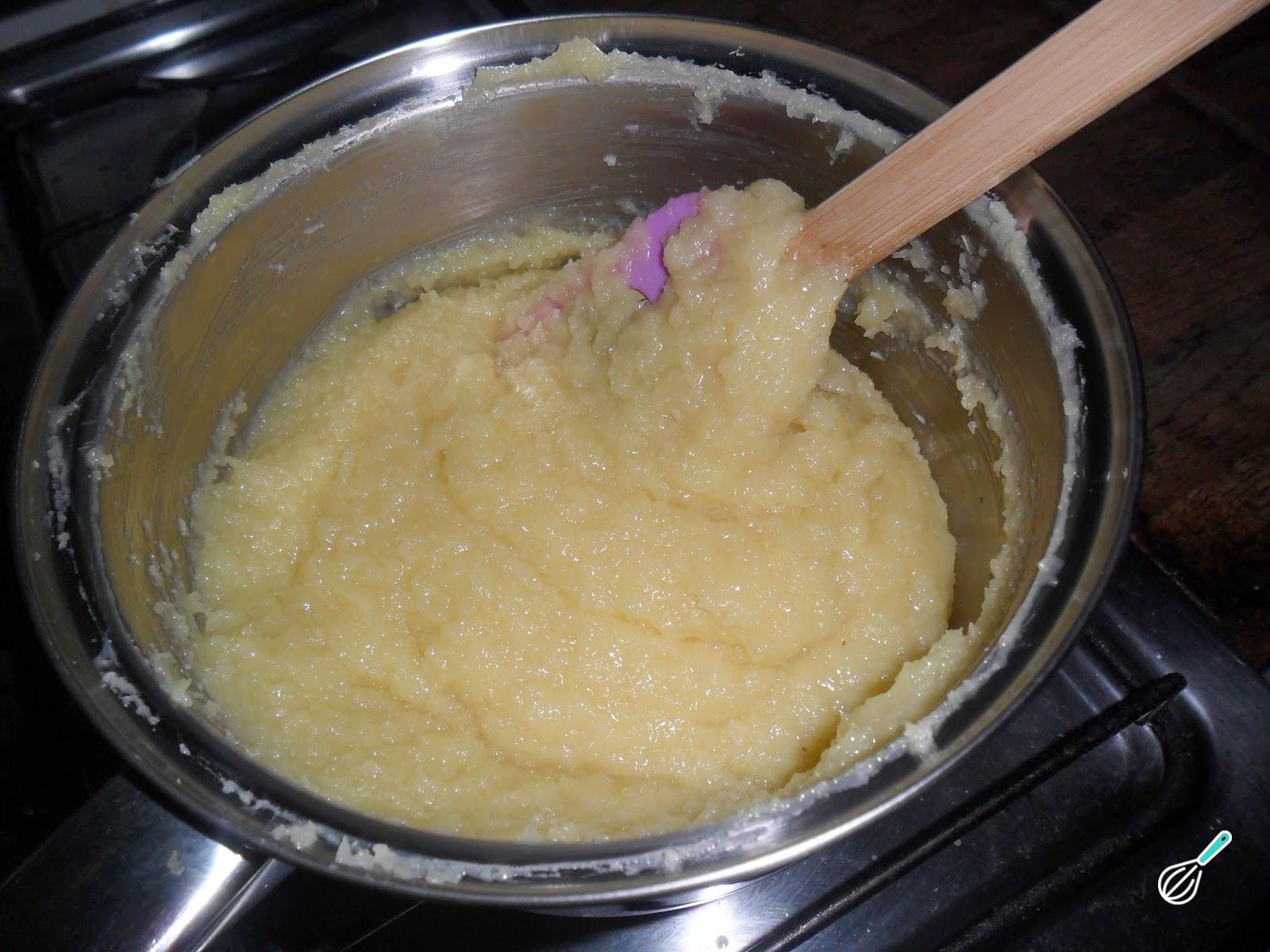 De seguida, coloque o leite condensado e margarina em uma panela em fogo baixo. Deixe derreter, junte o coco ralado e cozinhe até ferver. Retire do fogo e reserve o recheio do bolo bombom.