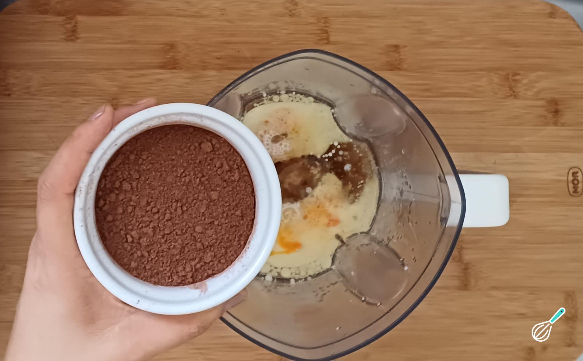 No liquidificador, bata os ovos, o leite, o óleo, o açúcar e o chocolate em pó, misturando bem.
