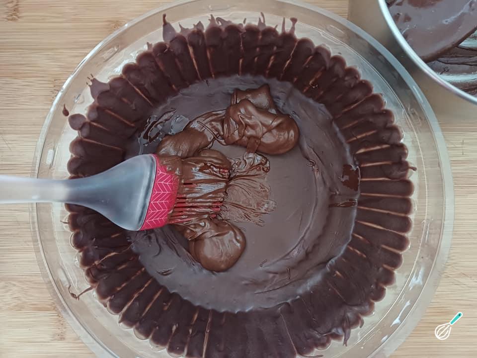 Numa embalagem de acetato com 20 cm de diâmetro, pincele metade da cobertura, espalhando bem para que preencha todos os espaços.