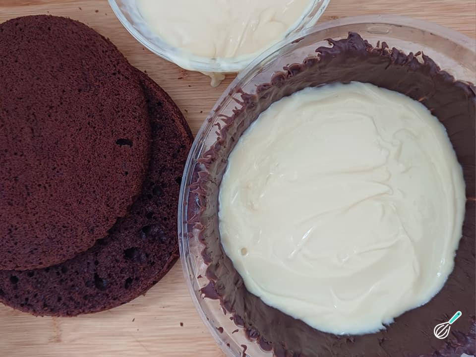 Corte o bolo ao meio e comece a montagem:
