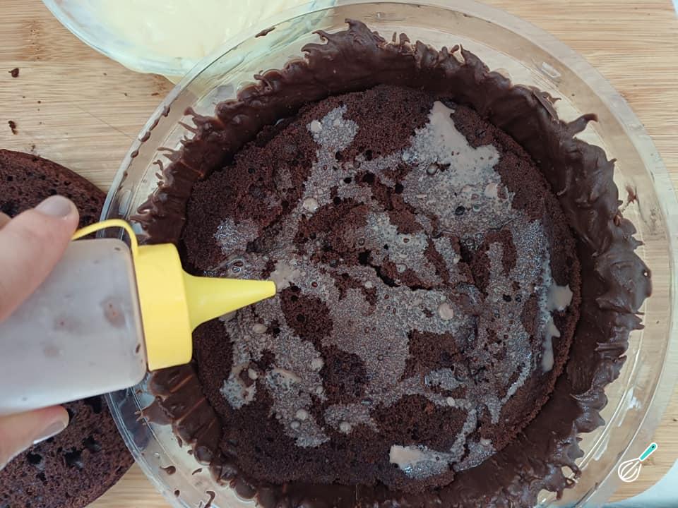 - Cubra com uma parte da massa do bolo e regue com a calda.