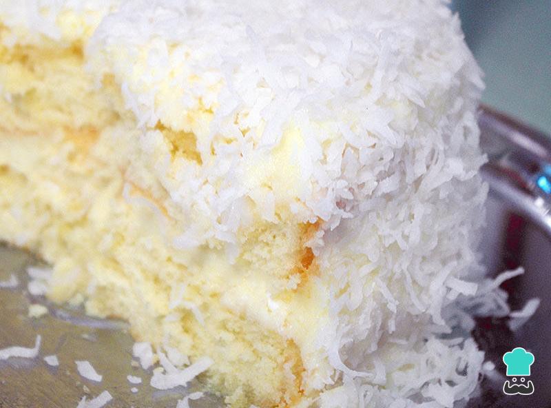 Para a cobertura, bata o creme tipo chantilly na batedeira até ficar na consistência desejada. Espalhe em todo o redor do bolo e complete polvilhando coco ralado.