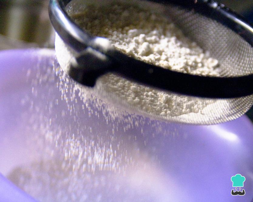 Junte todos os ingredientes, para execução da receita, e ligue o forno nos 180ºC. Peneire a farinha e o fermento em uma vasilha.