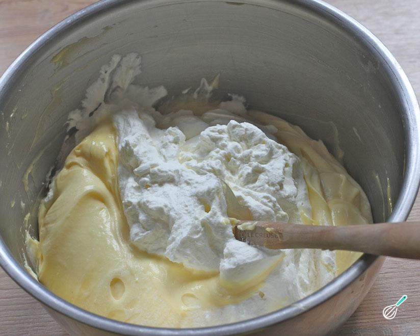Incorpore as claras na mistura anterior, usando uma espátula, e em movimentos envolventes. Isso é importante para não perder o ar das claras e fazer com que a massa do bolo fique bem leve e fofinha. Por último junte o fermento e mexa delicadamente.
