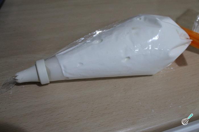Para finalizar prepare o glacê da cobertura: bata o creme de leite até ficar bem consistente, formando picos. Depois acrescente o açúcar e a essência de baunilha e continue batendo até virar um chantilly brilhante. Coloque num saco de confeiteiro com bico pitanga ou outro e use para decorar o bolo a gosto. Neste caso fizemos rosas de glacê.