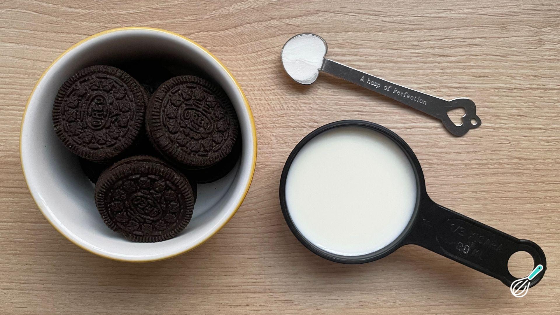 Separe os 3 ingredientes para o seu bolo super fácil: bolacha Oreo, leite e fermento em pó