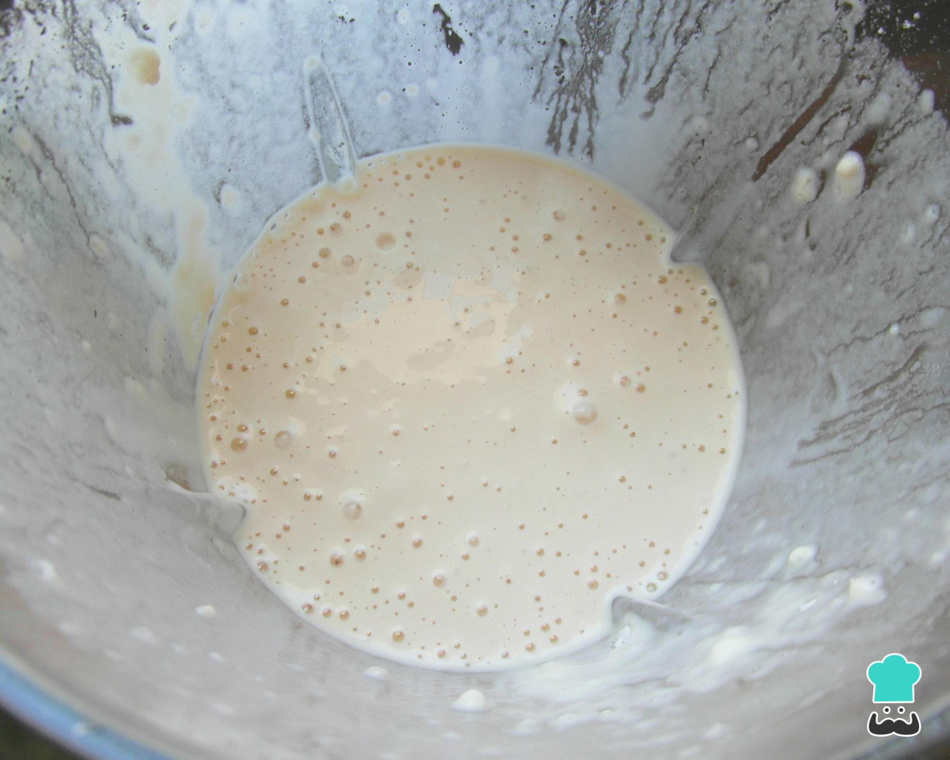 Ligue o forno nos 180ºC. Bata no liquidificador ou na batedeira a bebida vegetal, o iogurte grego, a pasta de amendoim, o ovo, as claras de ovo e o adoçante líquido.