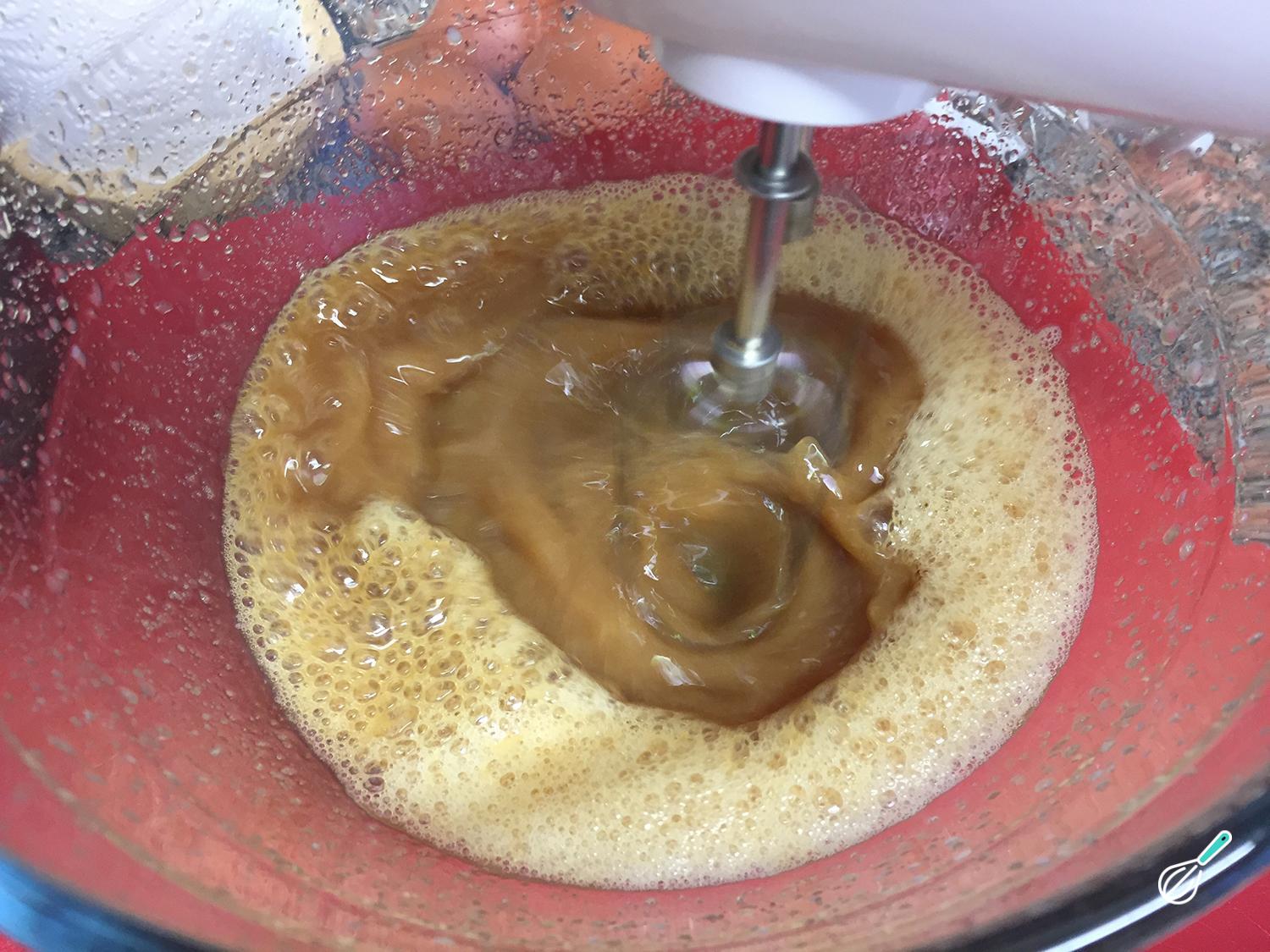 Para essa receita de bolo com cobertura de chocolate branco vamos preparar um bolo de caramelo e baunilha bem saboroso. Para isso comece batendo o caramelo e o açúcar até dissolver os grãos.