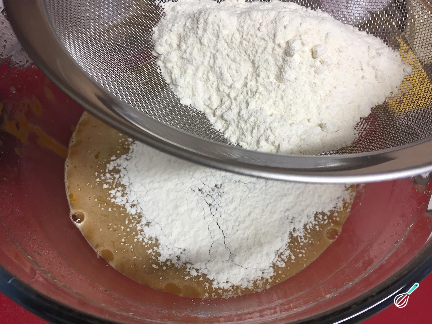 Finalmente adicione a farinha peneirada junto com o fermento e incorpore delicadamente na massa com a ajuda de uma espátula, para que não se formem grumos.