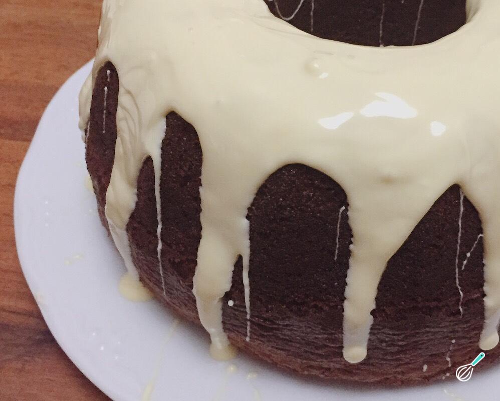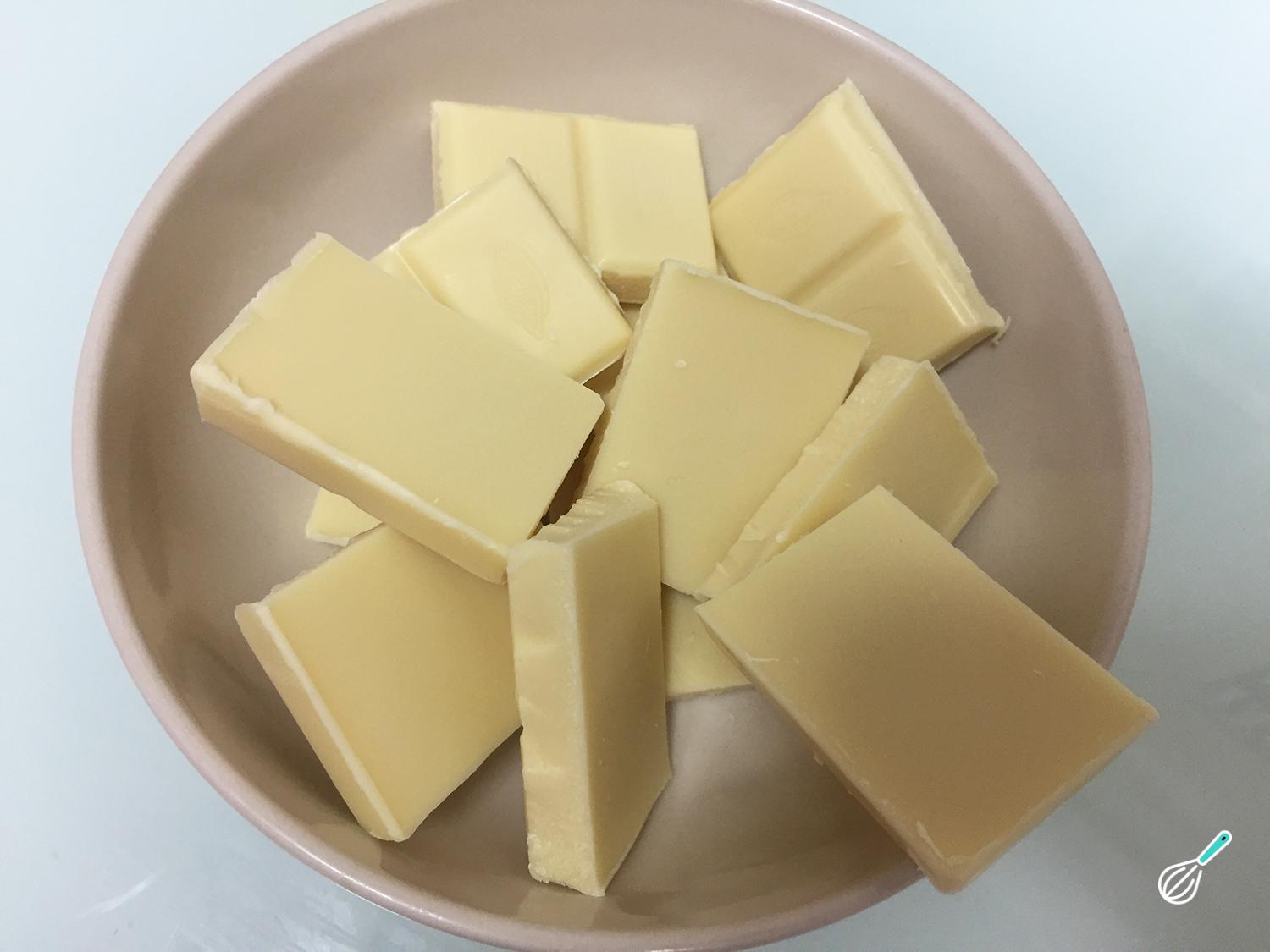 Enquanto o bolo esfria prepare a cobertura de chocolate branco, que irá torná-lo ainda mais saboroso! Para isso basta partir o chocolate em pedaços e levar a derreter em banho maria, que é o jeito mais seguro para derreter chocolate branco sem queimar. Se preferir também pode derreter no microondas, em potência máxima, de 30 em 30 segundos parando para mexer.