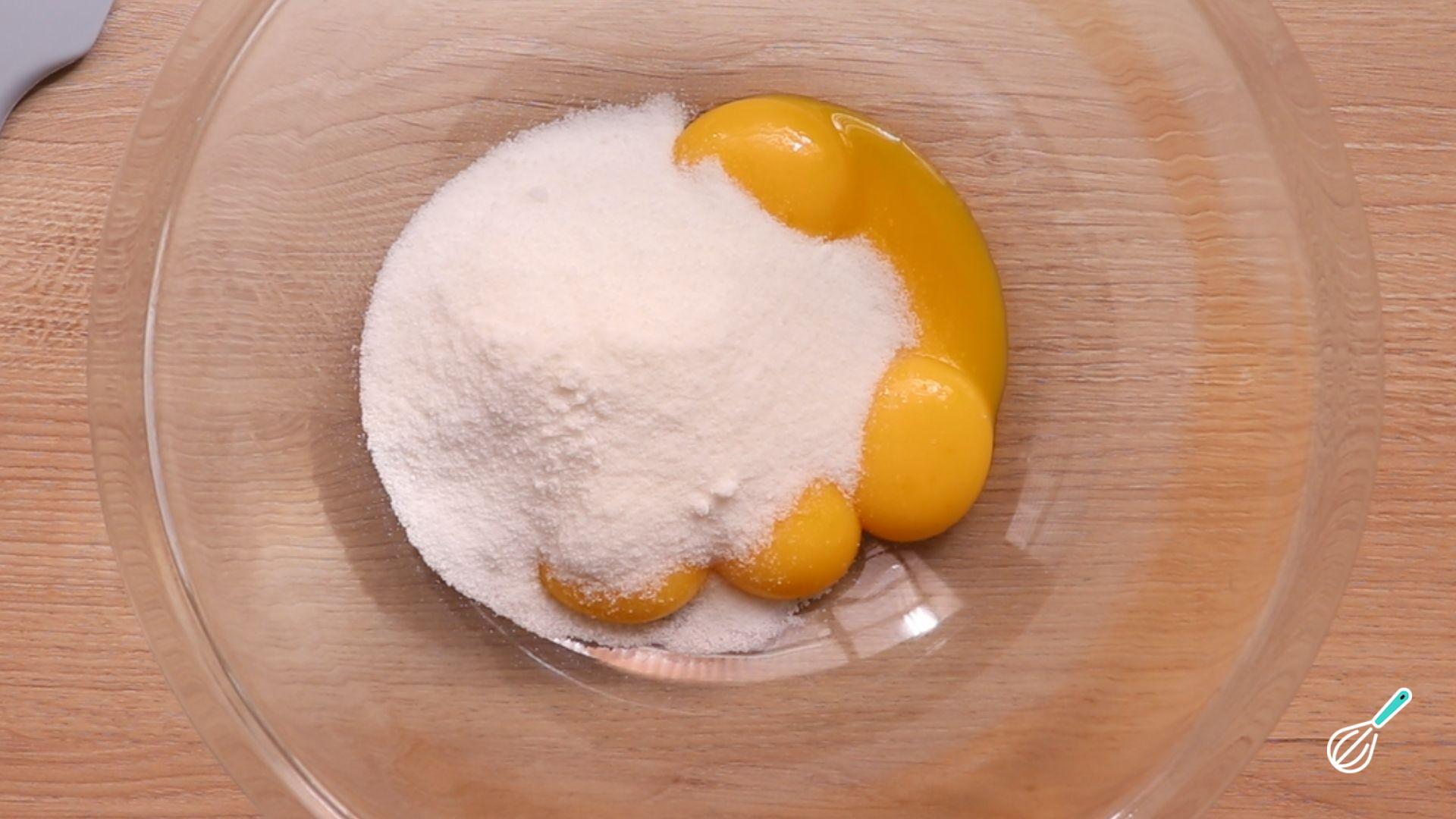 Bata as gemas com o açúcar até obter uma mistura clara e fofa.