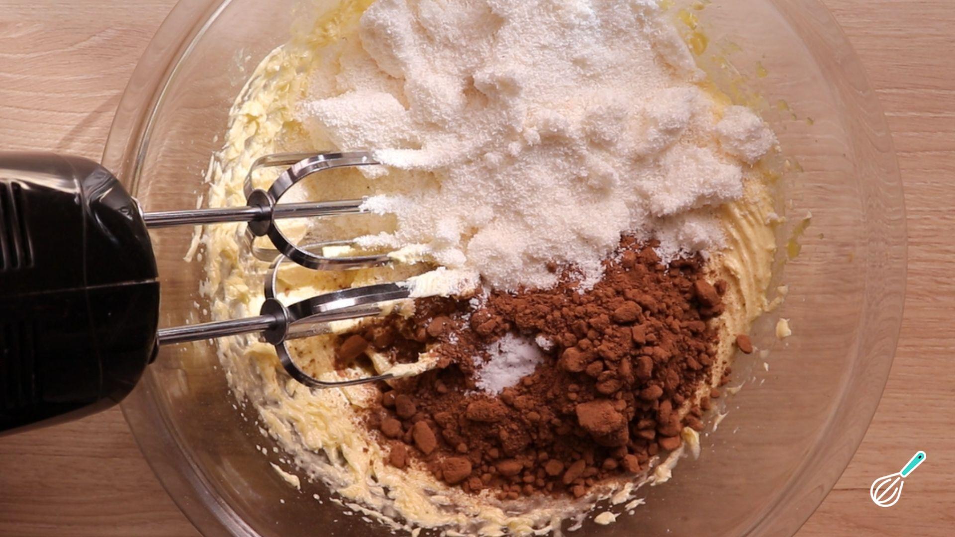 Acrescente o cacau em pó, a farinha de coco, uma pitada de sal e misture bem mais uma vez.