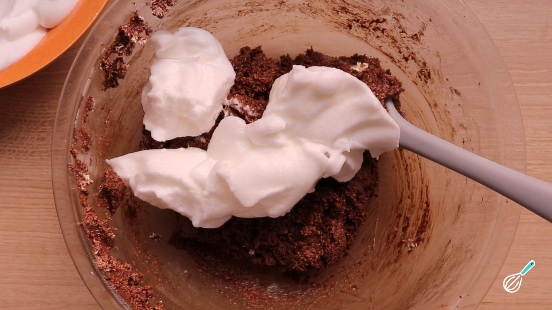 Bata as claras em neve e adicione aos poucos mexendo delicadamente. Finalize com o fermento em pó.