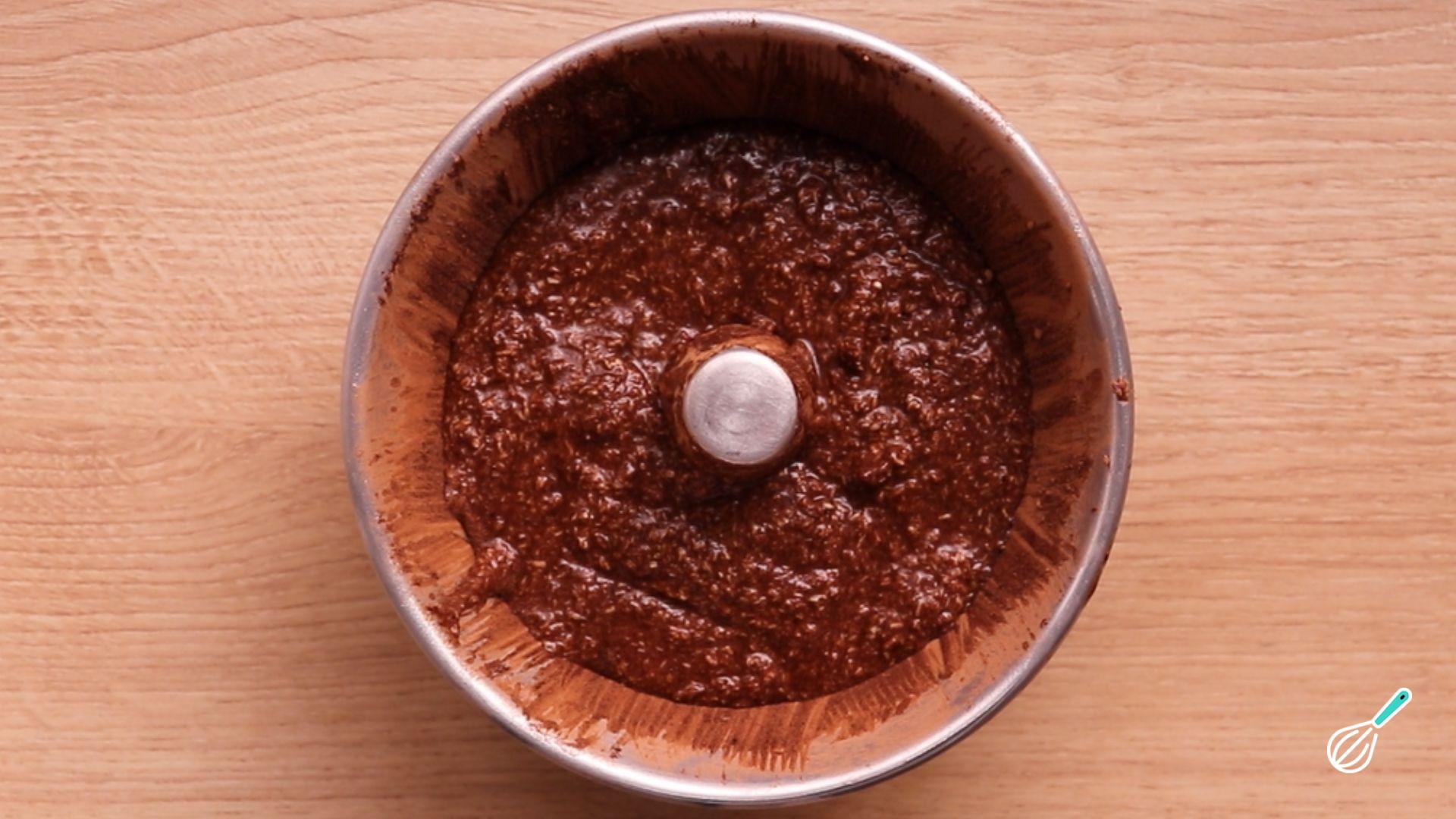 Despeje em uma forma untada e polvilhada com cacau e leve ao forno preaquecido à 180 graus por 40 minutos.