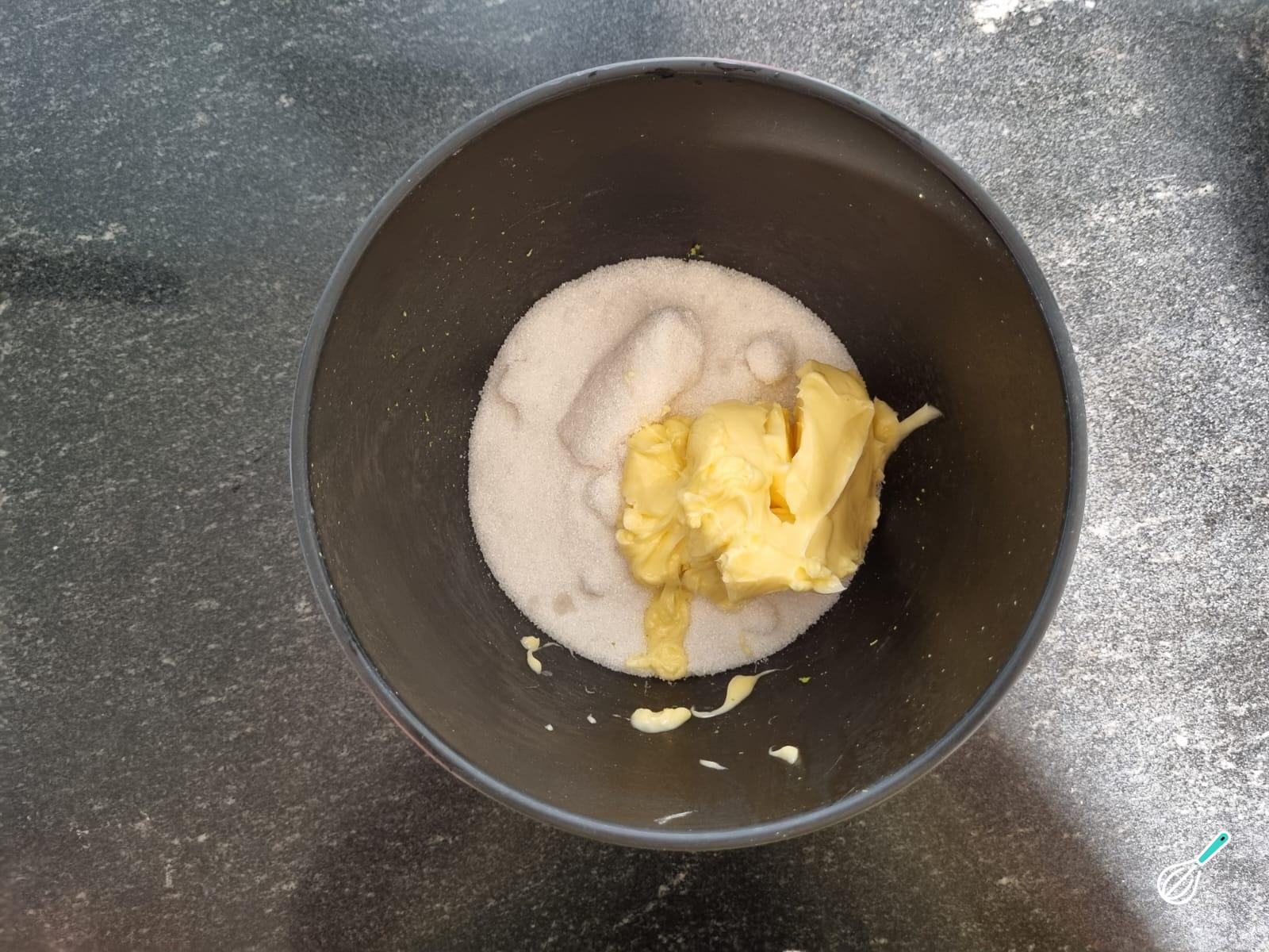 Numa tigela coloque o açúcar, a baunilha e a manteiga e bata bem até formar um creme fofo e esbranquiçado.