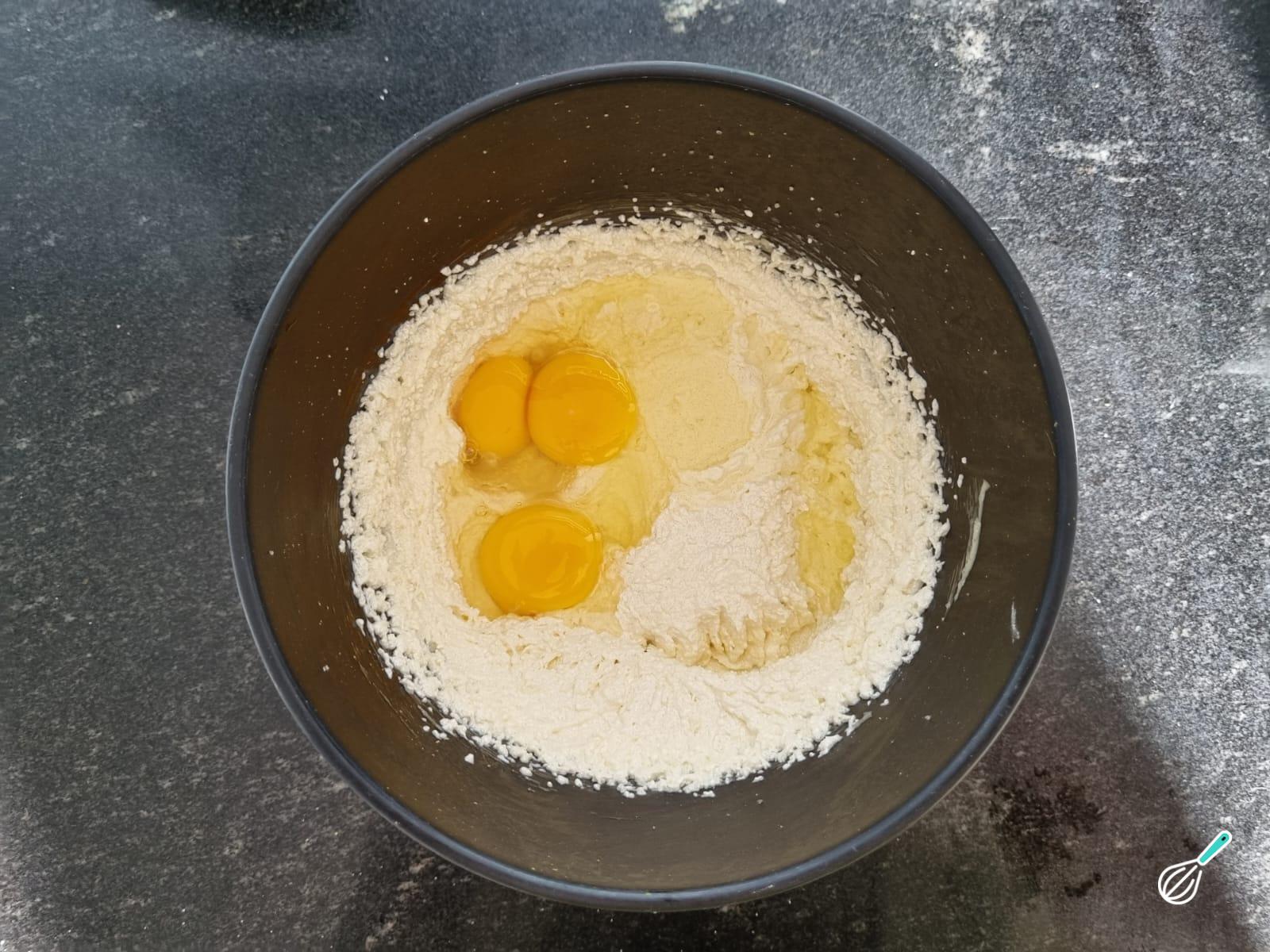 Acrescente os ovos, bata bem e coloque a farinha, o iogurte, o fermento e misture o suficiente para incorporar e formar uma massa lisa e homogênea.
