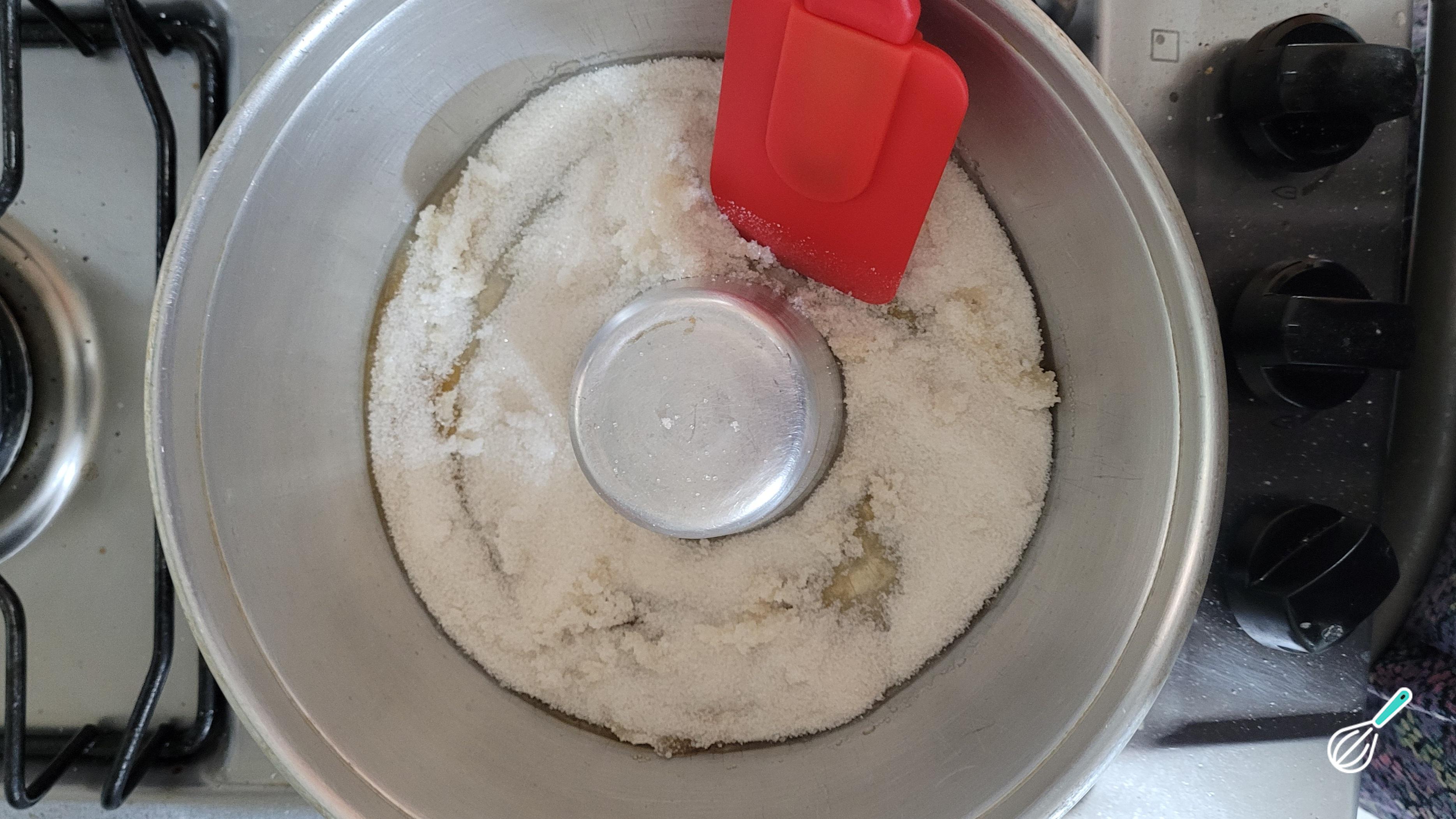 Vamos começar essa receita fácil de bolo de pudim! Coloque o açúcar em uma forma, de 22cm, com furo no meio. Leve ao fogo baixo e mexa, com uma espátula de silicone, para que o açúcar derreta por igual.
