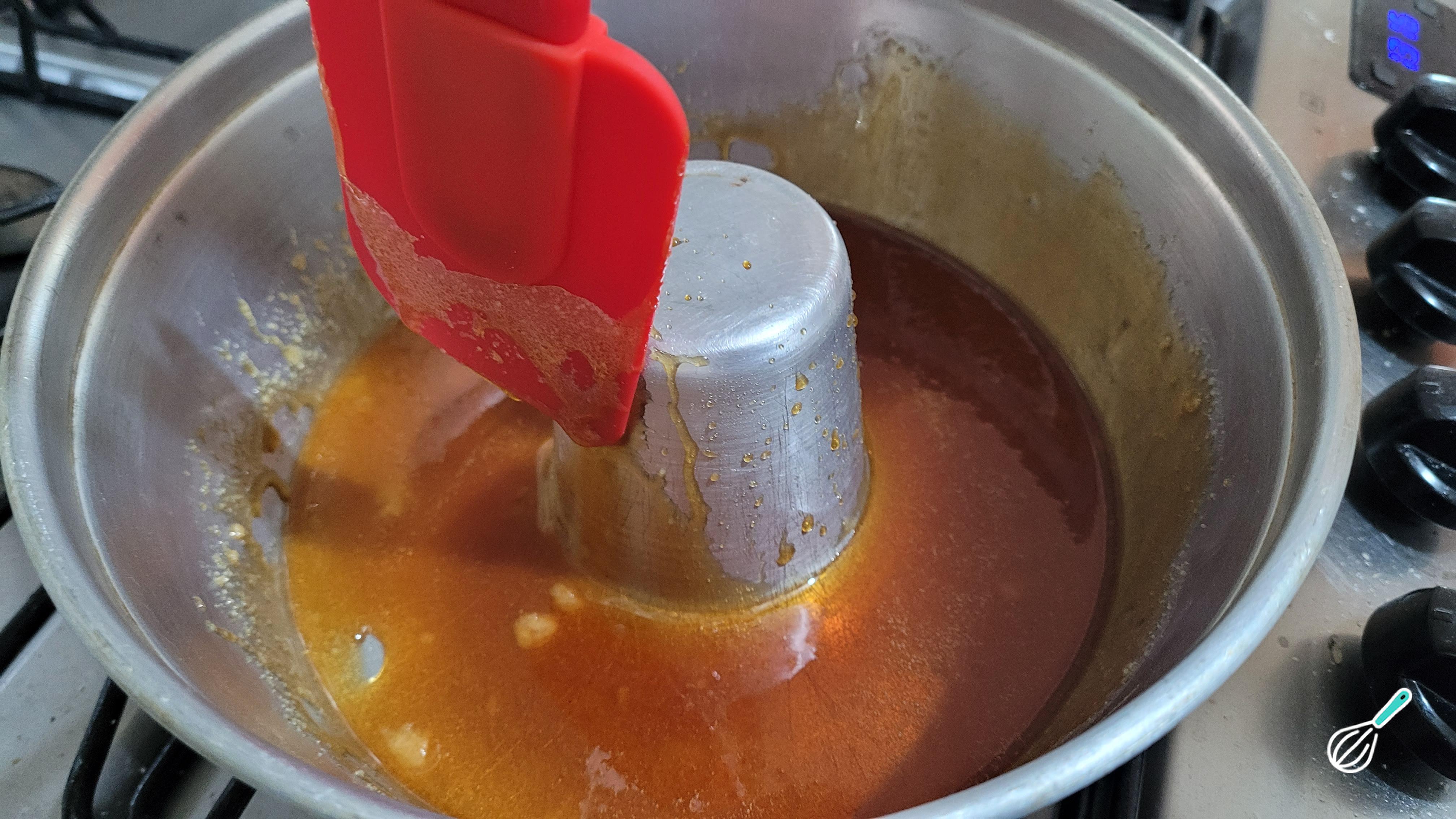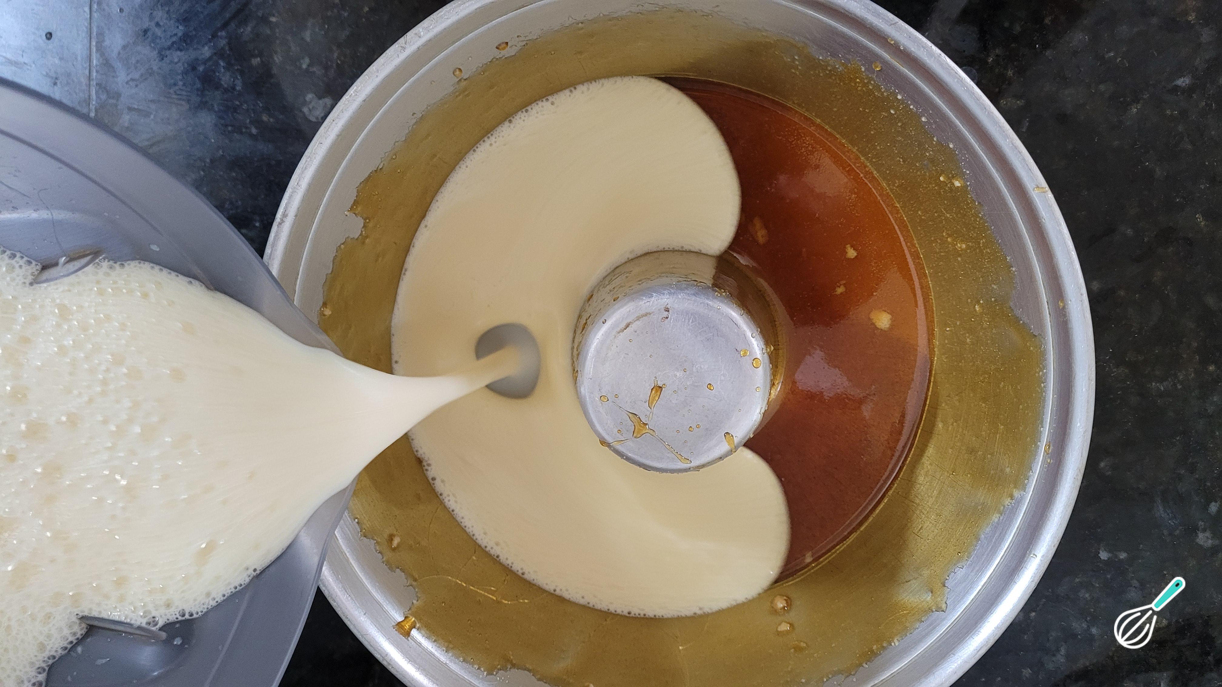 Depois que ele estiver derretido e com cor "caramelo", desligue o fogo e espalhe a calda nas laterais e no meio, como na foto. Reserve. Nossa receita terá um bolo com calda de pudim.
