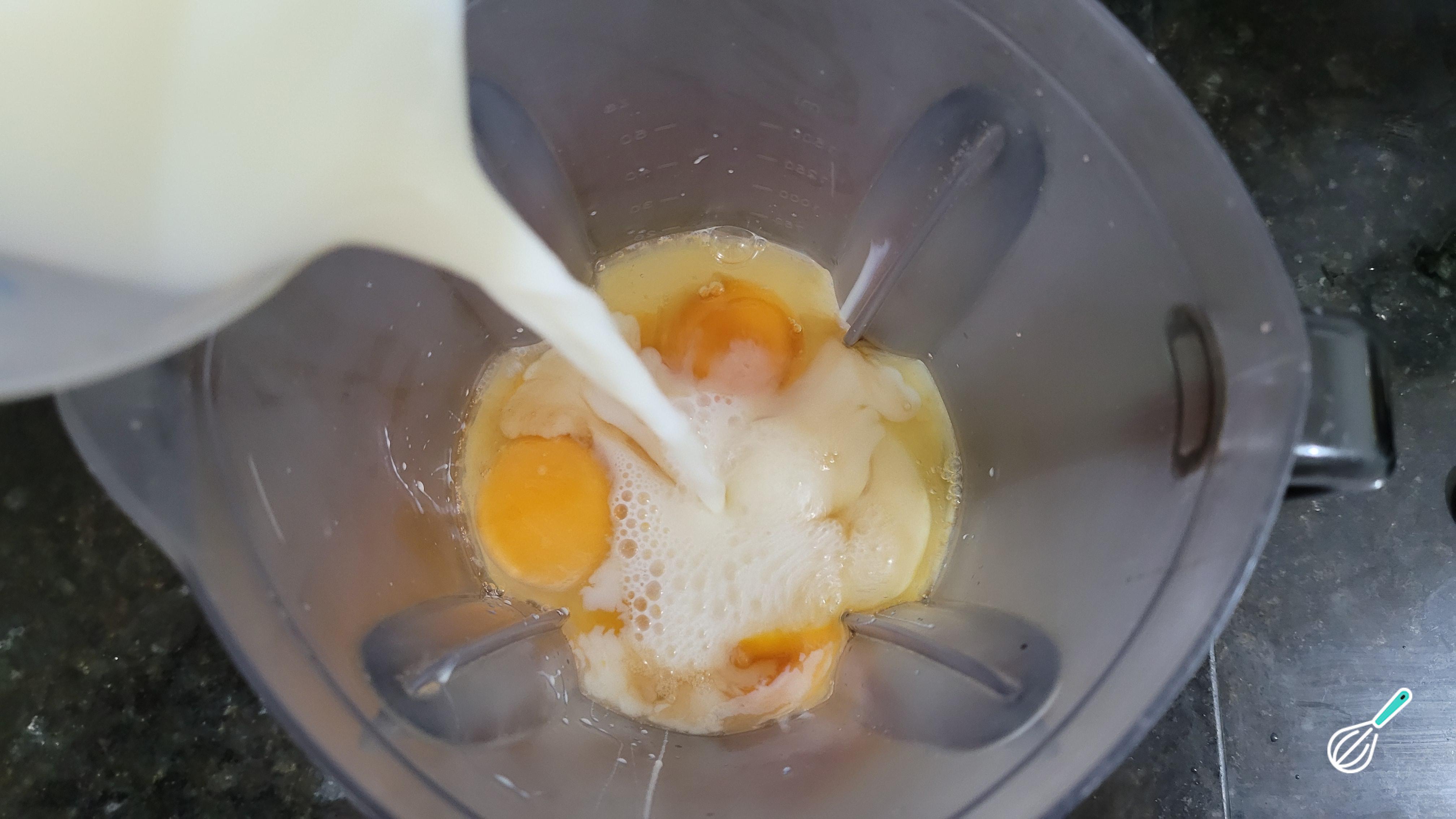 No liquidificador, coloque o leite condensado, os ovos, o leite e a essência de baunilha. Bata por 3 minutos.