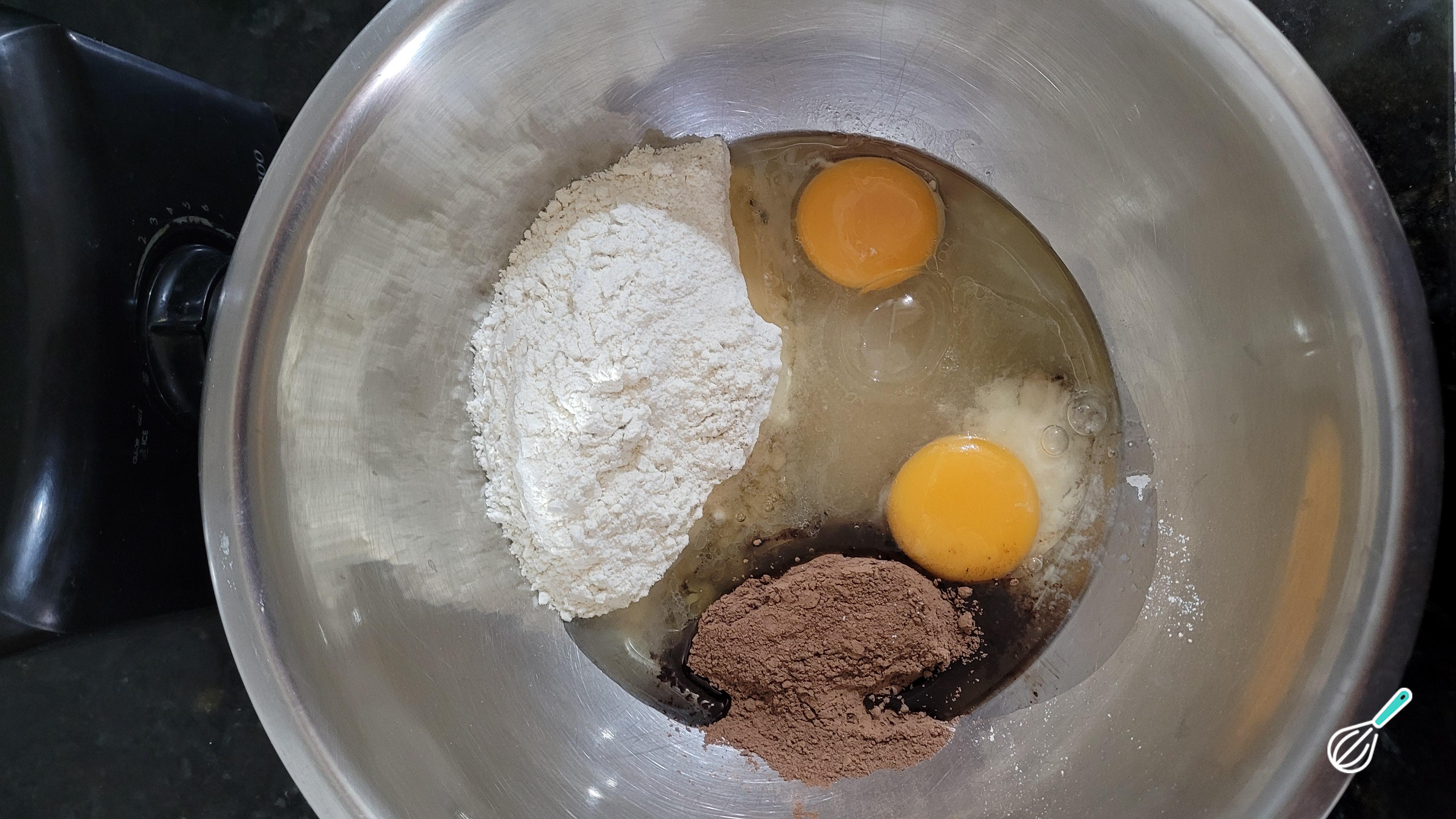 Em um recipiente, coloque o óleo, os ovos, o açúcar, o chocolate em pó 70%, a farinha de trigo e o fermento. Misture bem até que fique homogêneo.