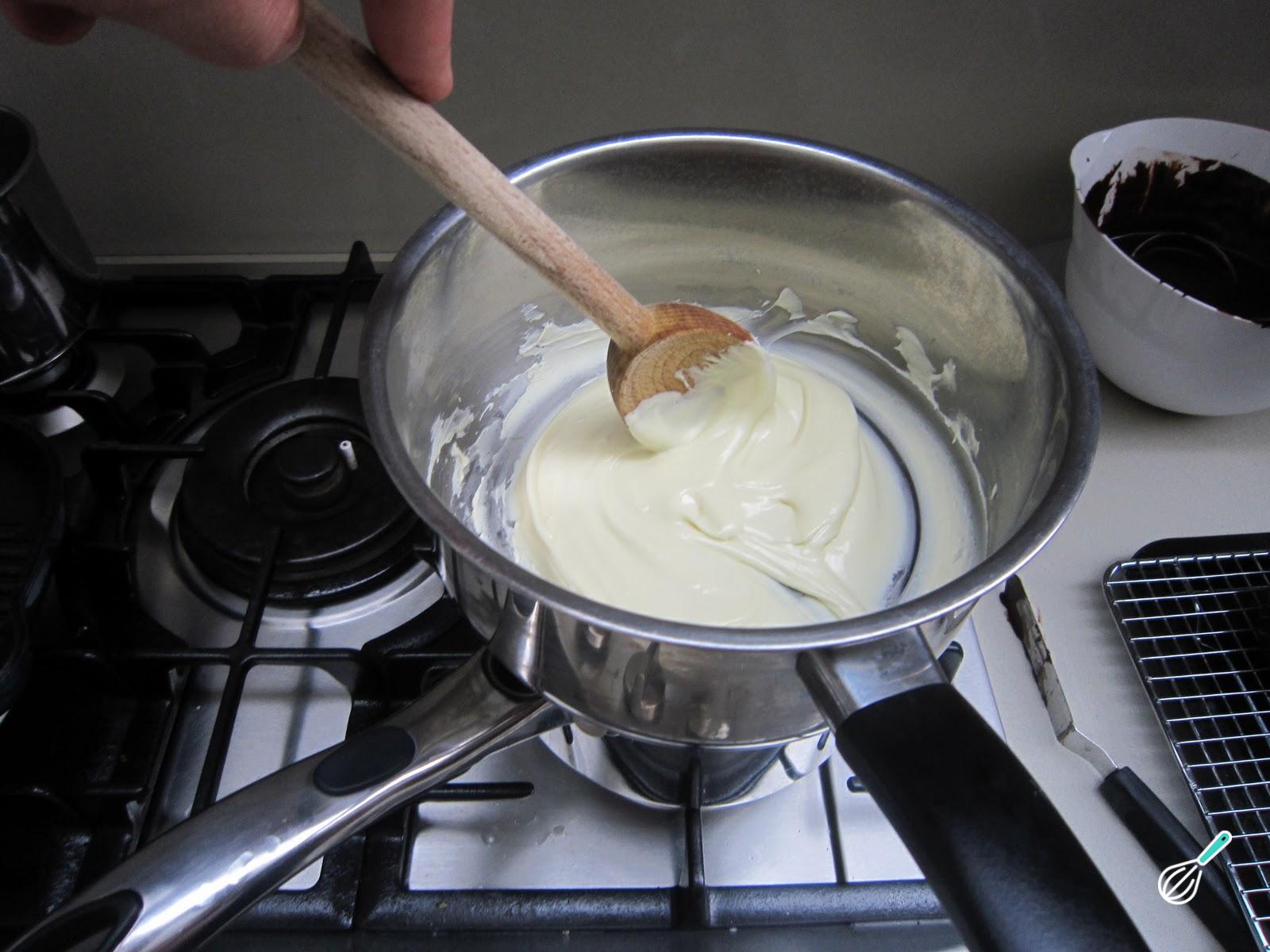 De seguida, derreta o chocolate branco com a água quente em uma panela a fogo baixo. Mexa até obter uma mistura uniforme e deixe esfriar.