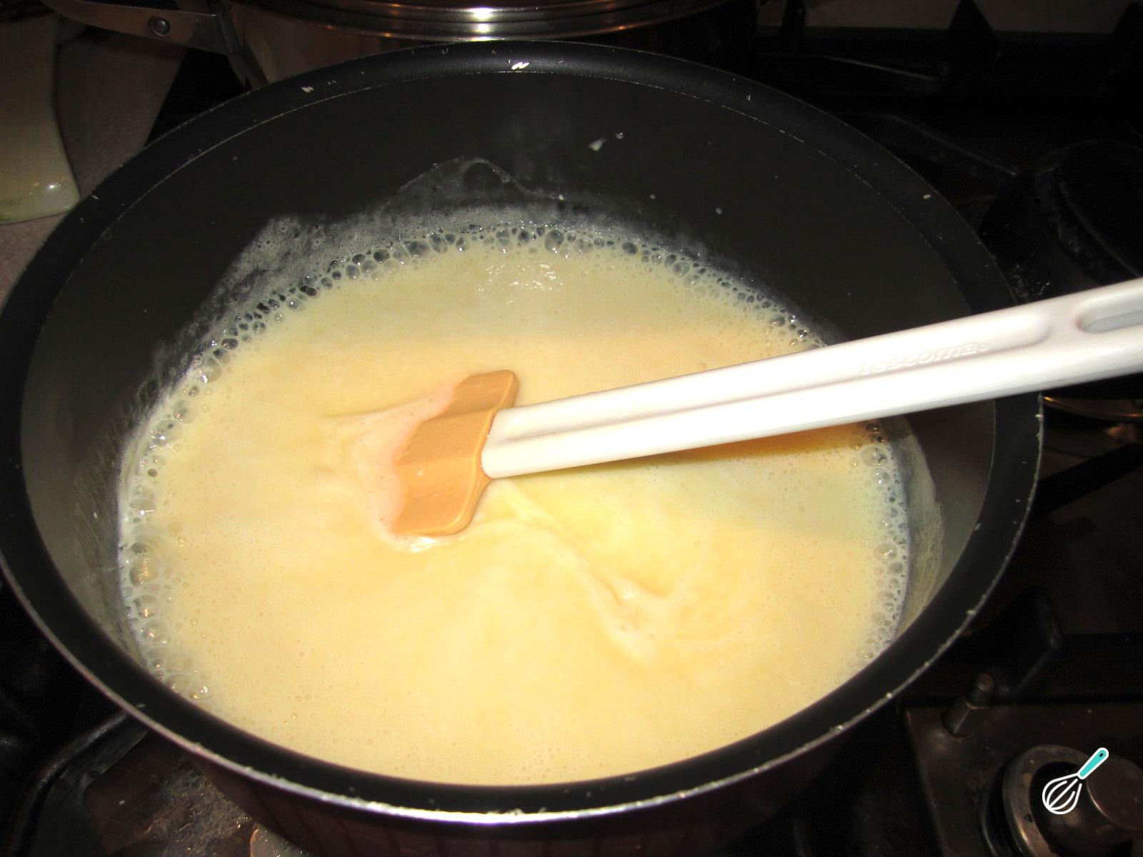 Para preparar o recheio, misture a farinha, o leite e o chocolate branco picado em uma panela. Cozinhe em fogo médio, mexendo sempre, até obter uma mistura consistente. Deixe esfriar.
