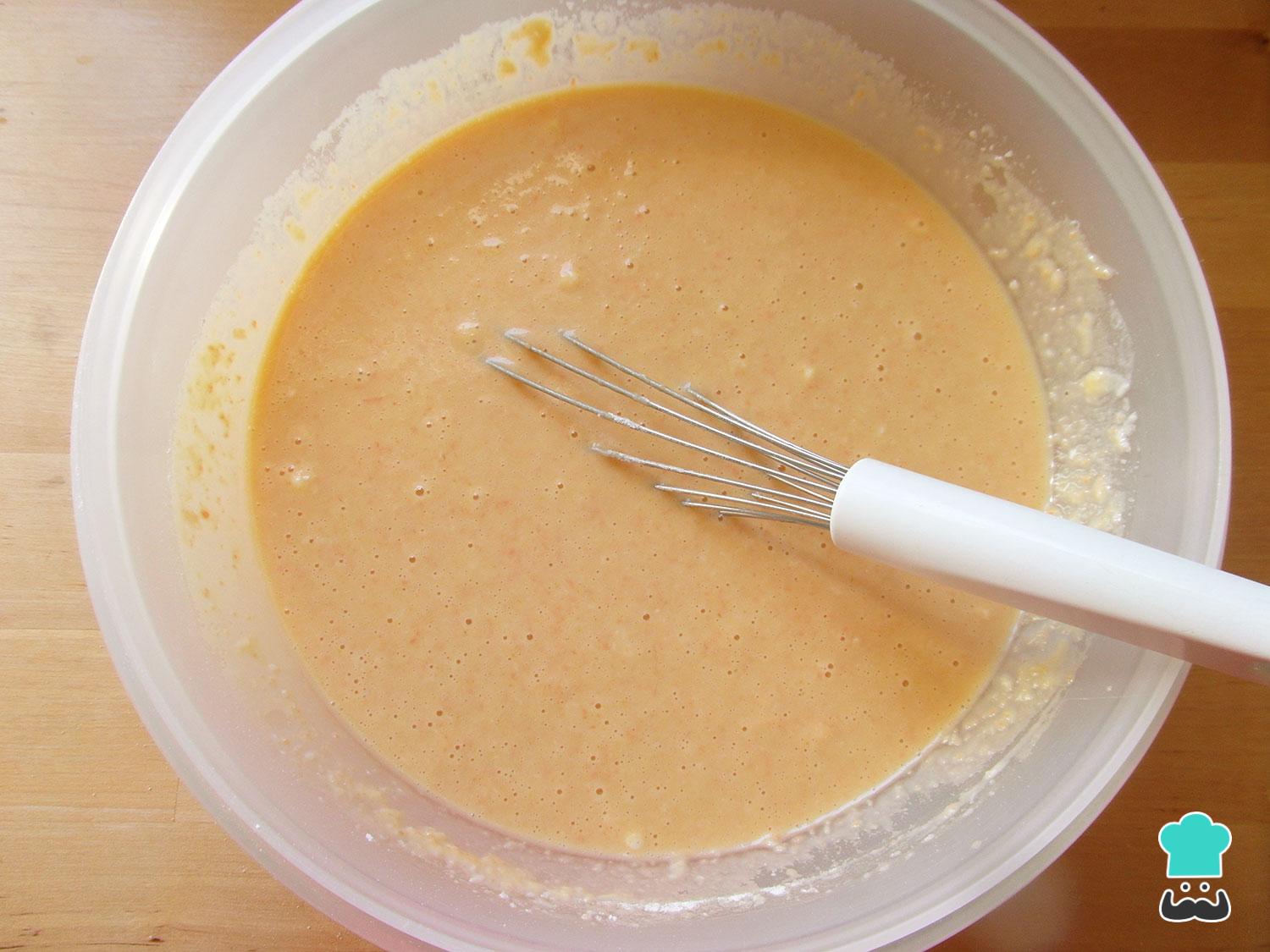 Peneire a farinha em um bowl e coloque a mistura do liquidificador. Mexa bem, até incorporar por completo. Acrescente o fermento e misture levemente com uma colher.