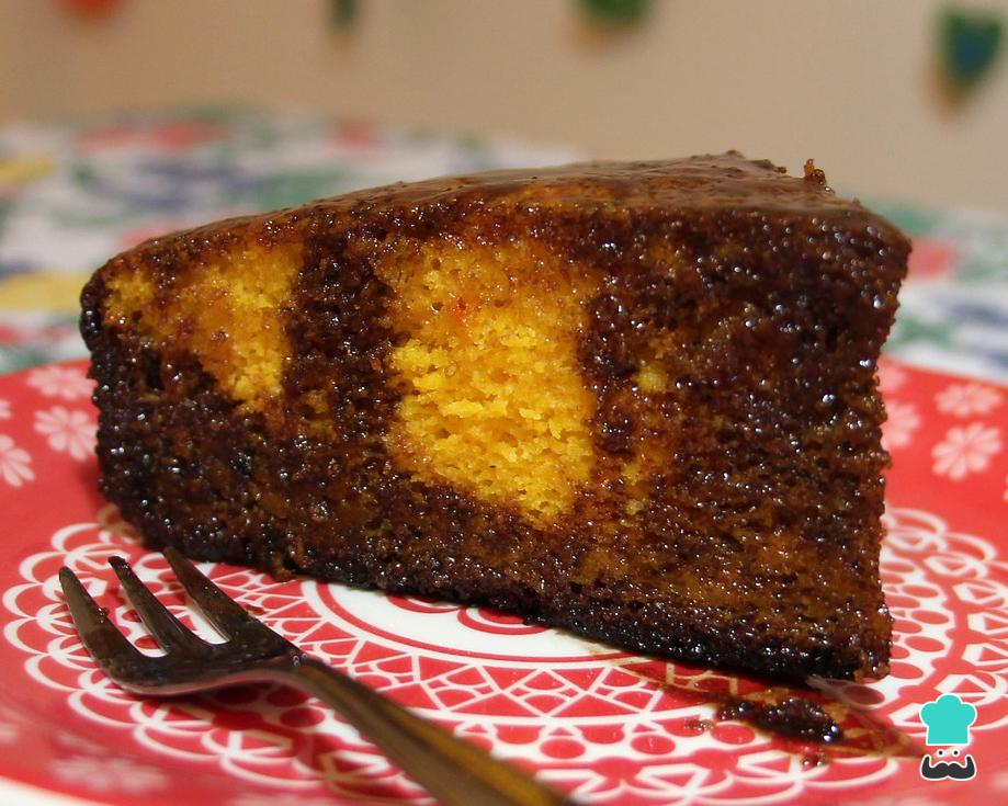 Quando o bolinho estiver assado retire do forno e deixe esfriar um pouco. Depois desenforme, pique com um garfo e despeje a calda por cima. Está pronto seu bolo de cenoura cremoso com chocolate, bom apetite!