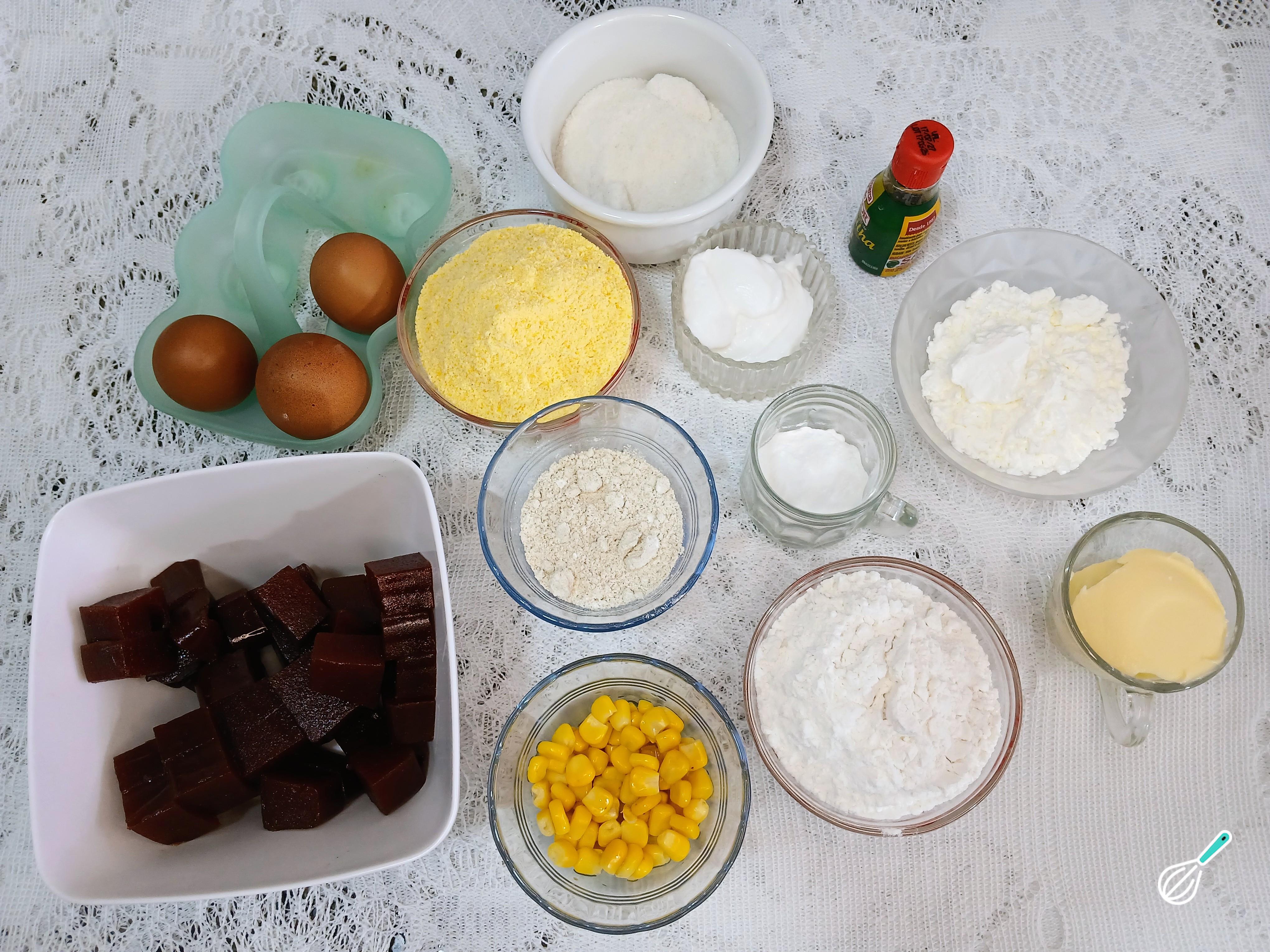Comece separando os ingredientes para o preparo do bolo cremoso de milho com goiabada. Separe a goiabada e corte em cubos pequenos. Separe o fubá, a farinha de arroz, a farinha de aveia e o amido de milho. Separe a margarina, o requeijão e a essência de baunilha. Separe o fermento químico e os ovos.