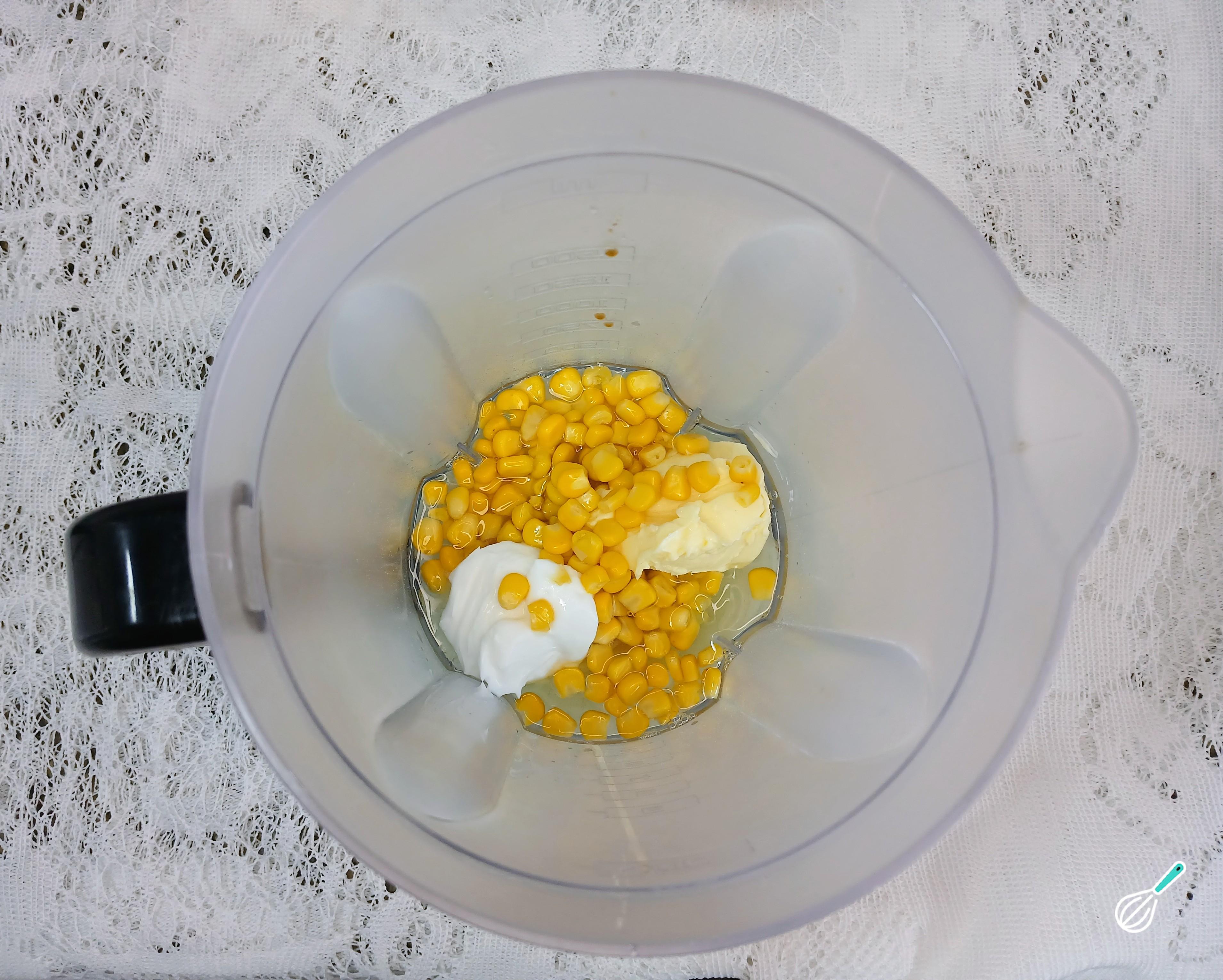 Feito isso, no liquidificador coloque o milho-verde em lata já escorrido, os ovos, a margarina ou manteiga, o açúcar, a essência de baunilha, o leite de coco e o requeijão. Bata tudo muito bem até ficar homogêneo.