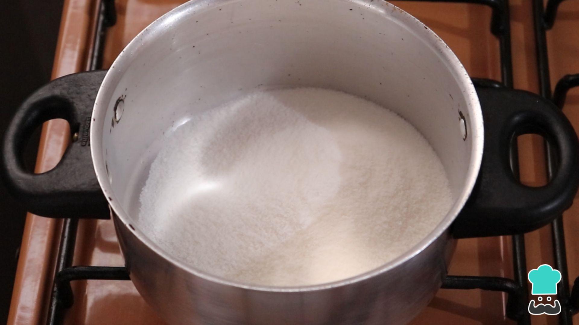 Para a cobertura crocante de amendoim, prepare o caramelo: leve uma panela ao fogo baixo e coloque o açúcar.