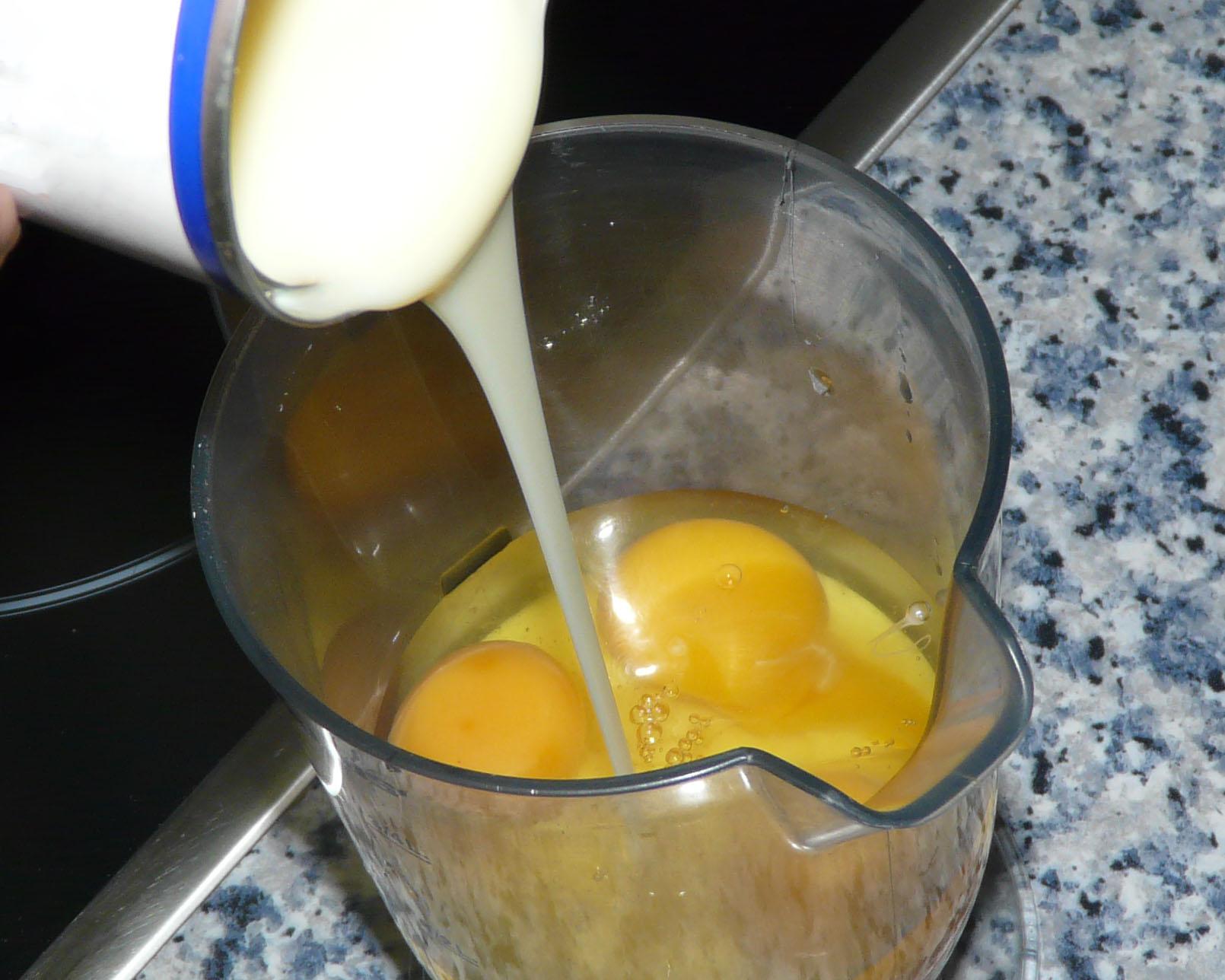 No liquidificador bata os restantes ingredientes: o leite, o leite condensado, os ovos, a manteiga ou margarina e a essência de baunilha.